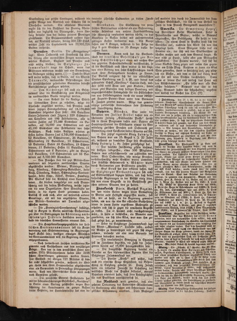 Bayern. München. Eine unter der Redaction von Julius Fröbel dahier neu er⸗ scheinende Zeitung„Süddeutsche Presse“ spricht sich in ihrem Programm dahin aus: Bayern als Hauptrepräsentant der Südstaaten nimmt die Ver⸗ mittelung zwischen Preußen und Oesterreich zur Vermeidung eines Conflictes beider Staaten auf sich.