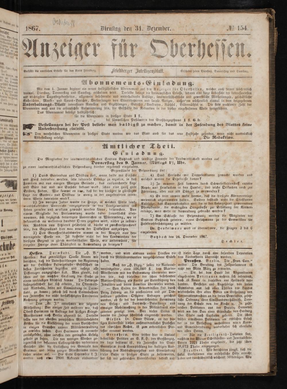 auf den Anzeiger für Oberhessen, welcher auch ferner wöchentlich