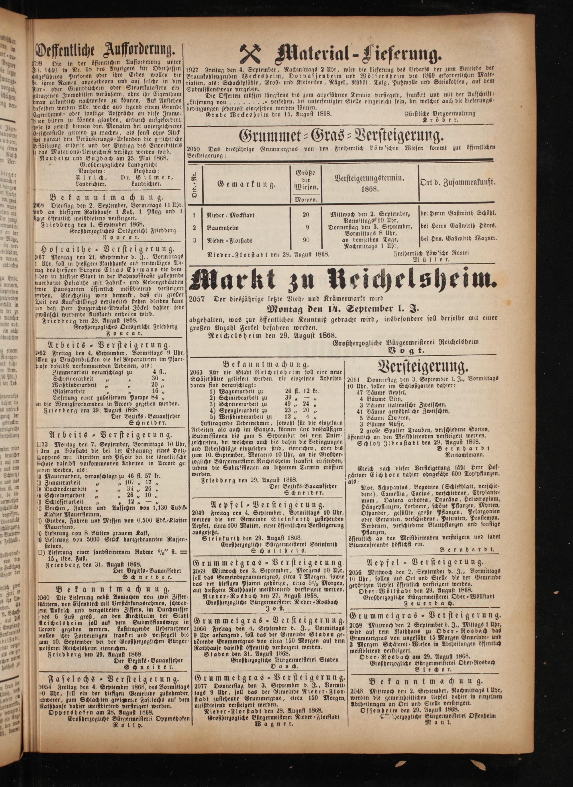 bien bilden zu können glauben, andurch aufgefordert, Kröber. dese so gewiß binnen drei Monaten bet unterzeichneter 7 72 Erichtsstelle geltend zu machen, als sonst ohne Rück 1 5 V 1 1 fit darauf den Veräußerungs⸗Urkunden die gerichtliche rummet 7 ras 7 er teigerung. stätigung ertbeilt und der t des Erwerbtltels 7 5 a 8 2 2 f bes Wabalions-Verzeicntz beisügt 9 5 A 2050 Das diesjährige Grummetgras von den Freiberrlich Lö w'schen Wlesen kommt zur öffentlichen Naubelm und Butzbach am 25. Mai 1868. Verstelgerung: 5 Großberzogliches Landgericht 5 5 1 Butzbach: 5 Größe lich. Dr. Gil mer, 85 47 ersteigerungstermin Landrichter. Landrichter. 8 Gemarkung. aper, Versteigerung Ort d. Zusammenkunft. 1. 51 8 9 Wiesen. 1868. Bekanntmachung. 0 Tec 268 Dienstag den 2. September, Vormittags 11 Uhr,. ud a ü f 1 9 1 5 4 Enge e ee ee Yflug un 1 Nieder- Mockstadt 20 Mittwoch den 2. September, eei Herrn Gastwirth Schöhl. Fri 5„ 8. Vormsttags“ 10 übr, i f ee See Friedberg] 2[ Bauernbeim 9 Donnersiag den 3. September, bel Herrn Gaftwirth Höres. 07 5 Vormittags 8 Uhr, F o ue a. 0 3 Nieder ⸗Florstadt 90 an demselben Tage, bei Hrn. Gastwirtb Wagner. Hofraithe⸗Versteigerung. Nachmittags 1 Uhs,