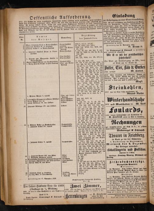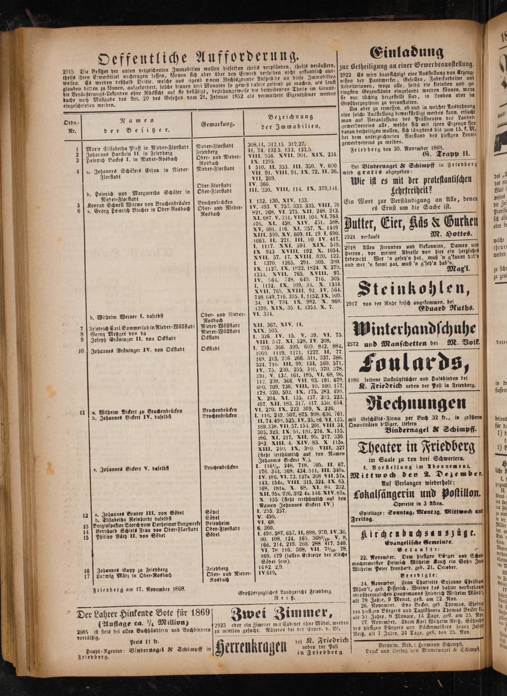 Ordn.⸗ Namen 6. Bezeichnung g. 2 3 Nr. der Besitz er. e der Immobilien. 1 Marie Clisabetba Pfaff in Nieder⸗Florstadt Nieder⸗Florstadt 308,14. 312,15, 312,27. N 2 Johannes Hanstein II. in Friedberg Friedberg II. 74. 132,5. 133. 133,5. 10 3 Heinrich Backes I. in Nieder ⸗Rosbach Ober⸗ und Nieder- VIII. 556. XVII. 901. XIX. 234. 11 Ros dach IX. 1295. 5 1 J a. Jobannes Schäfers Erben in Nieder⸗ Nieder⸗Florstadt 1 510. II. 353. III. 350. V. 600. 25 Florstadt VII. 91. VIII. 91. IX. 72. II. 36. 17 VII. 269. 17 Ober-Florstadt IV. 366. 8 d. Heimich und Margaretha Schäfer in[ Ober⸗Florstadt III. 230. VIII. 114. IX. 379,141. 0 Nieder⸗Florffadt . 5 Konrad Schnell Witwe von Bruchenbrücken Bruchenbrücken I. 132. 130. XIV. 133.. 15 6 a. Georg Heinrich Blecher in Ober Rosbach][ Ober⸗ und Nieder⸗ IV. 403. v. 257. 333. 335. VIII. 70 5 Rosbach 821. 268. VI. 275. XII. 248. 243. 5 XI. 687. v. 231. VIII. 104. VI. 764. 0 1 476. XI. 458. XIV. 431. 588. * XV. 681. 116. XI. 257. Xx. 1449 * XIII. 590. XV. 609. 11. 19. J. 690. 1 1063. 11. 221. III. 90 Iv. 417. 7 I. 1117. XXI. 591. XIX. 548. 5 IX 943 XVIII. 192. X. 1054. N 5 XVII. 57. 17. XVIII. 820. 122. I. 1370. 1265. 291. 305. 380. IX. 1127. IX. 1822. 1824. X. 279. 1334. XVII. 765. XVIII. 92. 19 IV. 564. 748. 649. 716. 305. 13 1. 1152. IX. 109. 34. X. 1334. . XVII. 765. XVIII. 92. IV. 564. 1 748. 649. 716. 305. I. 1152. IX. 109. 0 34. IV. 794. IX. 982. X. 968. 5 1279. XIX. 35. I. 1353. X. 7. N d. Wilbelm Werner I. daseldst Ober- und Nieder⸗ VI. 333. 19 Nosbach 1 7 Friedrich Carl Sommerlad in Nieder⸗Wöllftadt Nileder⸗Wöllstadt XII. 367. XIV. 14. 1 1 8 Georg Metzger von da Nieder⸗Wöllstadt XIX. 505. 0 5 9 J Joseph Groͤninger II. von Odftadt Odftadt I. 326. IV. 15. V. 39. VI. 75. 14 10 VIII. 517. XI. 528. IV. 208. 14„ 10 gobannes Bröninger IV. von Odstadt Odstadt 1. 295. 366. 399. 609. 842. 884. 1 5 1000. 1119. 1171. 1227. 11. 77. 14 19 169. 213. 236 266. 311. 337. 386. 0. 524. 716. 111. 99. 134. 560. 571. g 5 IV. 75. 230. 255. 310. 370. 378. 1 8 391. V. 132. 161. 185. VI. 68. 96. 1 112. 238. 366. VII. 93. 191. 679. 1 680. 709. 736. VIII. 10. 100. 177. 1 178. 320. 502. IX. 175. 283. 498. 1104 X. 204. XI. 135. 157. 203. 223. 15„ 497. XII. 183. 317. 417. 550. 654. 04 11a. Wühelm Bickert zu Bruchenbrücken Bruchenbrücken vI. 270. IX. 223. 309. X. 226. 1.. d. Johannes Bickert IV. daselbft Bruchenbrücken I. 116. 249. 507. 875. 998. 636. 761. 1 11. 74. 498. 525. I V. 35. 86. VI. 125. N 189. 338. VII. 57. 154. 201. VIII. 34. 0 305. 323. IX. 51. 181. 276. X. 155. 160 186. XI. 217. XII. 95. 217. 336. 1 0 323. XIII. 4. XIV. 83. X 1152. 1 XIII. 240. ix. 30, viII. 327 1(feht irribümlich auf den Namen 9 Johannes Bickert V.). 3 e. Johannes Bickert V. daselbst Bruchenbrücken I. 116½. 248. 718. 705. II. 67. 101 176. 344. 368. 434. 511. III. 340a. 0 IV. 186. VI. 73. 127 368 VII. 57a. 143. 1543. 7111. 315. 324. IX. 65. 168. 18186. X. 68. XI. 84. 232. XII. 95. 226. 382. 4a. 146. XIV. d. X. 155(steht trrthümlich auf den N Namen Johannes Bickert IV.) 1 122. Jobannes Bender III. von Soͤdel Södel I. 255. 257. N d. Elisabetha Reinbardt daselbff Södel V. 450. 13 Berginspeklor Storch vom Dorhbelmer Bergwerke] Betenhelm VI. 68. 14 J Berabard Schtels Frau von Ober⸗Florstadt] Oder⸗Florstadt 6. 360. 15 J Philipp Väth II. von Södel Soͤdel I. 498. 587. 657. II. 898. 970. IV. 36. 80. 108. 124. 165. 368/10. V. 8. 166. 214. 219. 260. 288. 417. 540. VI. 78. 116. 368. VII. 710. 78. 169. 179(sollen Erbleihe der Kirche Södel sein). 16 Johannes Supp zu Friedberg Friedberg 14 82. 2.9. 17] Ludwig März in Ober⸗Nos bach Ober- und Nieder⸗IV.I9. Ros bach