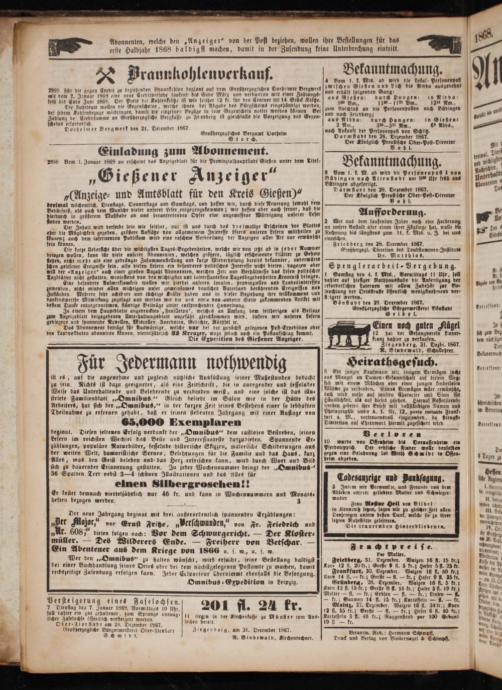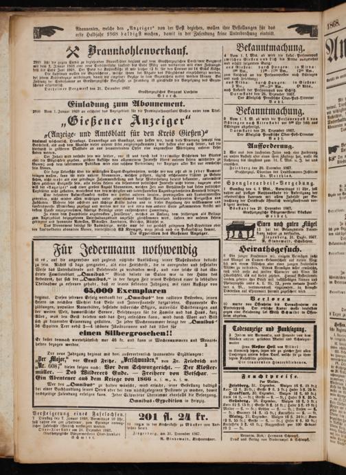 2998 Vom 1. Januar 1868 an erscheint das Anzeigeblatt für die Provinztalhauptstadt Gießen unter dem Titel: