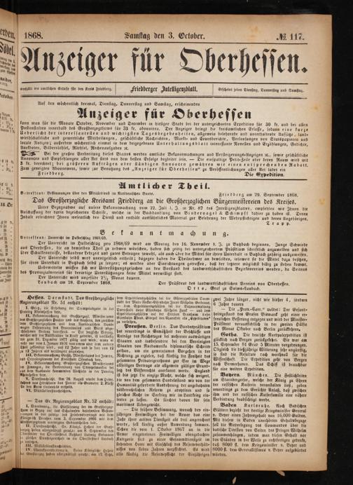Zum geneigten Abonnement, sowie zur Benutzung des„Anzeiger für Oberhessen“ zu Veröffentlichungen aller Art ladet ein