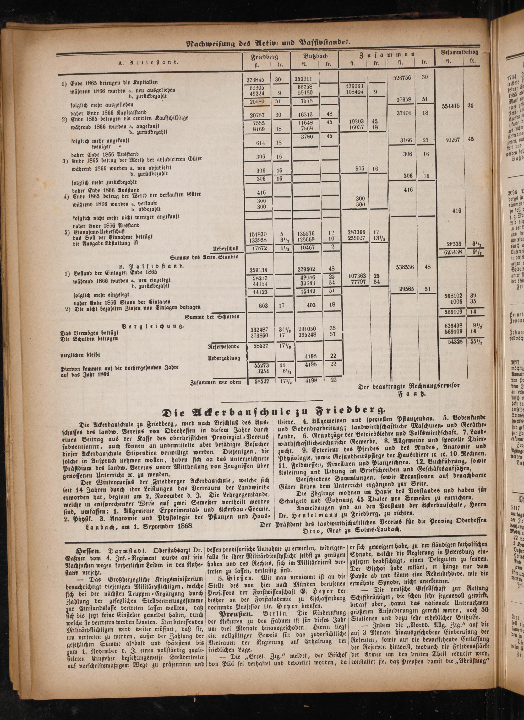 Die Ackerbauschule zu Friedberg, wird nach Beschluß des Aus⸗ schusses des landw. Vereins von Oderhessen in diesem Jahre durch Kasse des oberhessischen Provinzial Vereins subventionirt, auch können an unbemittelte aber befähigte Besucher dieser Ackerbauschule Stipendien verwilligt werden.