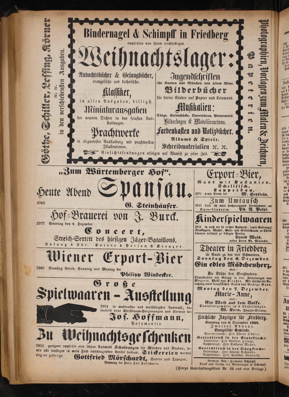 Kirchliche Anzeigen für Friedberg. Sonntag den 6. December 1868. Zweiter Advent. Evangelische Gemeinde. Pfarram:swoche: Herr Pfarrer Köhler. Gottesdienst in der Stadtkirche