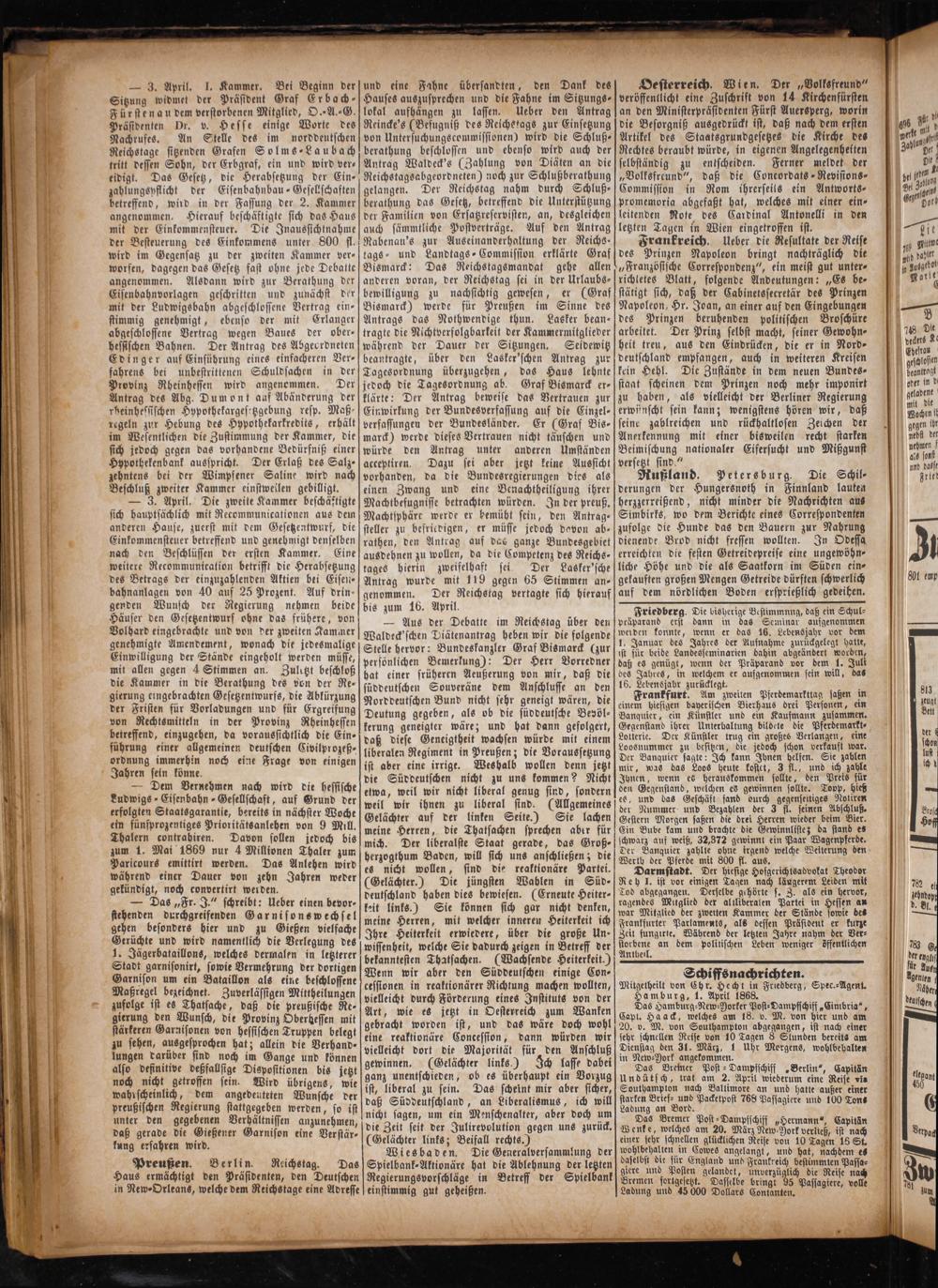 — Aus der Debatte im Reichstag über den Waldeck'schen Diätenantrag heben wir die folgende Stelle hervor: Bundeskanzler Graf Bismarck(zur persönlichen Bemerkung): Der Herr Vorredner hat einer früheren Aeußerung von mir, daß die süddeutschen Souveräne dem Anschlusse an den Norddeutschen Bund nicht sehr geneigt wären, die Deutung gegeben, als ob die süddeutsche Bevöl⸗ kerung geneigter wäre; und hat dann gefolgert, daß diese Geneigtheit wachsen würde mit einem liberalen Regiment in Preußen; die Voraussetzung ist aber eine irrige. Weshalb wollen denn jetzt die Süddeutschen nicht zu uns kommen? Nicht etwa, weil wir nicht liberal genug sind, sondern weil wir ihnen zu liberal sind.(Allgemeines Gelächter auf der linken Seite.) Sie lachen meine Herren, die Thatsachen sprechen aber für mich. Der liberalste Staat gerade, das Groß— herzogthum Baden, will sich uns anschließen; die es nicht wollen, sind die reaktionäre Partei. (Gelächter.) Die jüngsten Wahlen in Süd- deutschland haben dies bewiesen.(Erneute Heiter⸗ keit links.) Sie können sich gar nicht denken, meine Herren, mit welcher inneren Heiterkeit ich Ihre Heiterkeit erwiedere, über die große Un⸗ wissenheit, welche Sie dadurch zeigen in Betreff der bekanntesten Thatsachen.(Wachsende Heiterkeit.) Wenn wir aber den Süddeutschen einige Con- cessionen in reaktionärer Richtung machen wollten, vielleicht durch Förderung eines Instituts von der Art, wie es jetzt in Oesterreich zum Wanken gebracht worden ist, und das wäre doch wohl eine reaktionäre Concession, dann würden wir vielleicht dort die Majorität für den Anschluß gewinnen.(Gelächter links.) Ich lasse dabei ganz unentschieden, ob es überhaupt ein Vorzug ist, liberal zu sein. Das scheint mir aber sicher, daß Süddeutschland, an Liberalismus, ich will nicht sagen, um ein Menschenalter, aber doch um die Zeit seit der Julirevolution gegen uns zurück. (Gelächter links; Beifall rechts.)