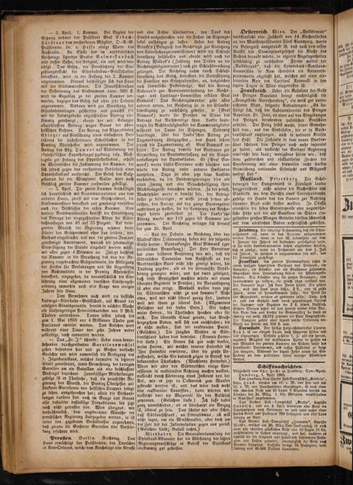 Das Hamburg⸗New⸗Porker Post⸗Oampfschiff„Cimbria“, Capt. Haack, welches am 18. v. M. von hier und am 20. v. M. von Southampton abgegangen, ist nach einer sehr schnellen Reise von 10 Tagen 8 Stunden bereits am Dienstag den 31. März, 1 Uhr Morgens, wohlbehalten in New⸗York angekommen.