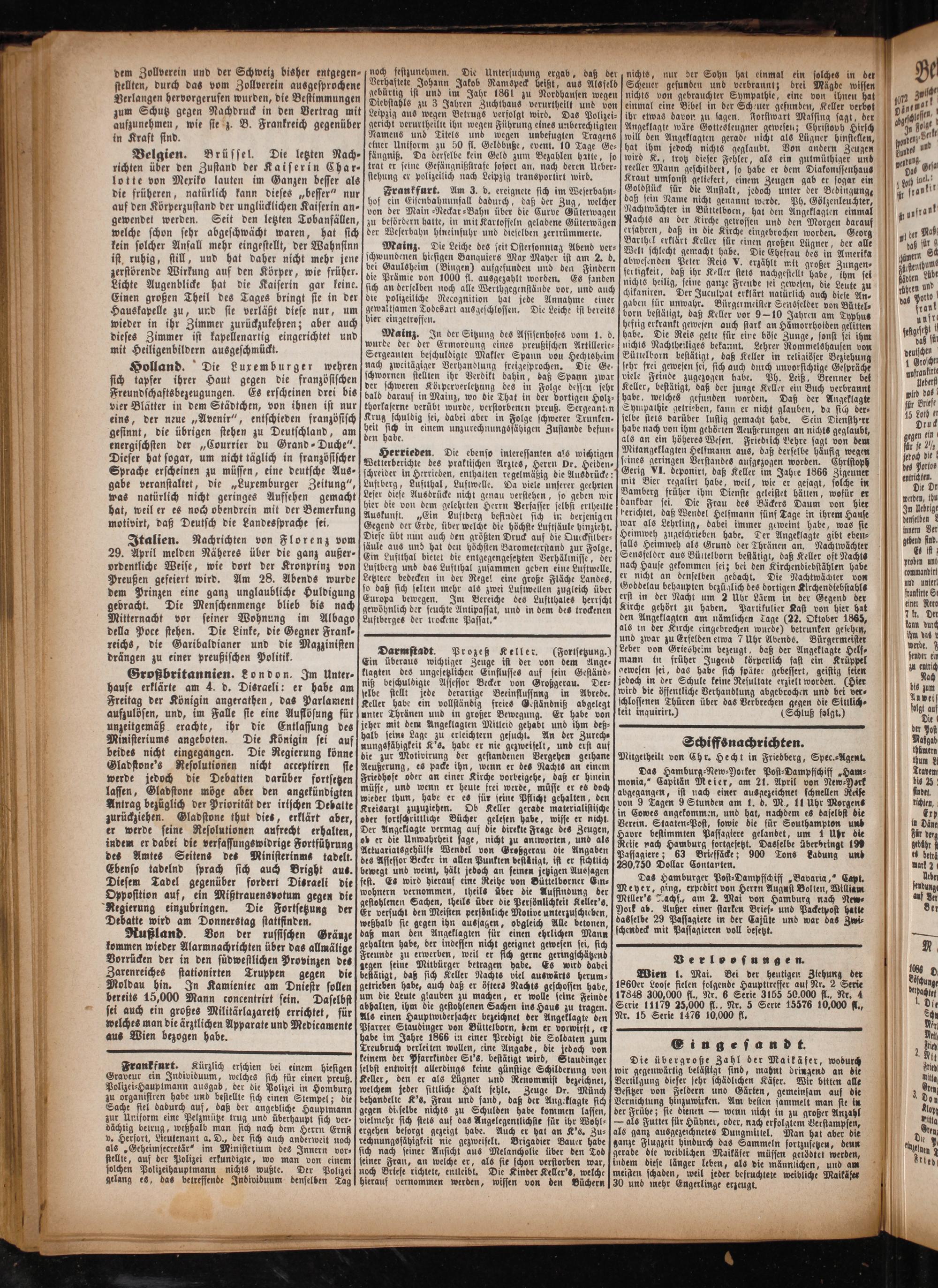 Darmstadt. Prozeß Keller.(Fortsetzung.) Ein überaus wichtiger Zeuge ist der von dem Ange⸗ klagten des ungesetzlichen Einflusses auf sein Geständ⸗ niß beschuldigte Assessor Becker von Großgerau. Der⸗ selbe stellt jede derartige Beeinflussung in Abrede. Keller habe ein vollständig freies Geständniß abgelegt unter Thränen und in großer Bewegung. Er habe von jeher mit dem Angeklagten Mitleid gehabt und ihm deß⸗ halb seine Lage zu erleichtern gesucht. An der Zurech⸗ nungsfähigkeit K's. habe er nie gezweifelt, und erst auf die zur Motirirung der gestandenen Vergehen geihane Aeußerung, es packe ihn, wenn er des Nachts an einem Friedhofe oder an einer Kirche vorbeigehe, daß er hinein müsse, und wenn er heute frei werde, müsse er es doch wieder thun, habe er es für seine Pflicht gehalten, den Kreisarzt zuzuziehen. Ob Keller gerade materialistische oder sortschrittliche Bücher gelesen habe, wisse er nicht. Der Angeklagte vermag auf die direkte Frage des Zeugen, ob er die Unwahrheit sage, nicht zu antworten, und als Actuariatsgehülfe Wendel von Großgerau die Angaben des Assessor Becker in allen Punkten betätigt, ist er fichtlich bewegt und weint, hält jedoch an seinen jetzigen Aussagen fest. Es wird hierauf eine Reihe von Büttelborner Ein⸗ wohnern vernommen, theils über die Auffindung der gestohlenen Sachen, theils über die Persönlichkeit Keller's. Er versucht den Meisten persöͤnliche Molive unterzuschieben, weßhalb sie gegen ihn aussagen, obgleich Alle betonen, daß man den Angeklagten für einen ehrlichen Mann gehalten habe, der indessen nicht geeignet gewesen sei, sich Freunde zu erwerben, weil er sich gerne geringschätzend gegen seine Mitbürger betragen habe. Es wird dabei bestätigt, daß sich Keller Nachts viel auswärts herum⸗ getrieben habe, auch daß er öfters Nachts geschossen habe, um die Leute glauben zu machen, er wolle seine Feinde abhalten, ihm die gestohlenen Sachen ins Haus zu tragen. Als einen Hauptwidersacher bezeichnet der Angeklagte den Pfarrer Staudinger von Büttelborn, dem er vorwirft, er habe im Jahre 1866 in einer Predigt die Soldaten zum Treubruch verleiten wollen, eine Angabe, die jedoch von keinem der Pfarrkinder St's, bestätigt wird, Staudinger selbst entwirft allerdings keine günstige Schilderung von Keller, den er als Lügner und Renommist bezeichnet, welchem jeder sittliche Halt fehle. Zeuge Dr. Münch behandelte K's. Frau und fand, daß der Angeklagte sich gegen dieselbe nichts zu Schulden habe kommen lassen, vielmehr sich stets auf das Angelegentlichste für ihr Wohl⸗ ergehen besorgt gezeigt habe. Auch er hat an K's. Zu⸗ rechnungsfähigkeit nie gezweifelt. Brigadier Bauer habe sich nach seiner Ansicht aus Melancholie über den Tod seiner Fran, an welche er, als sie schon verstorben war, noch Briefe richtete, entleibt. Die Kinder Keller's, welche