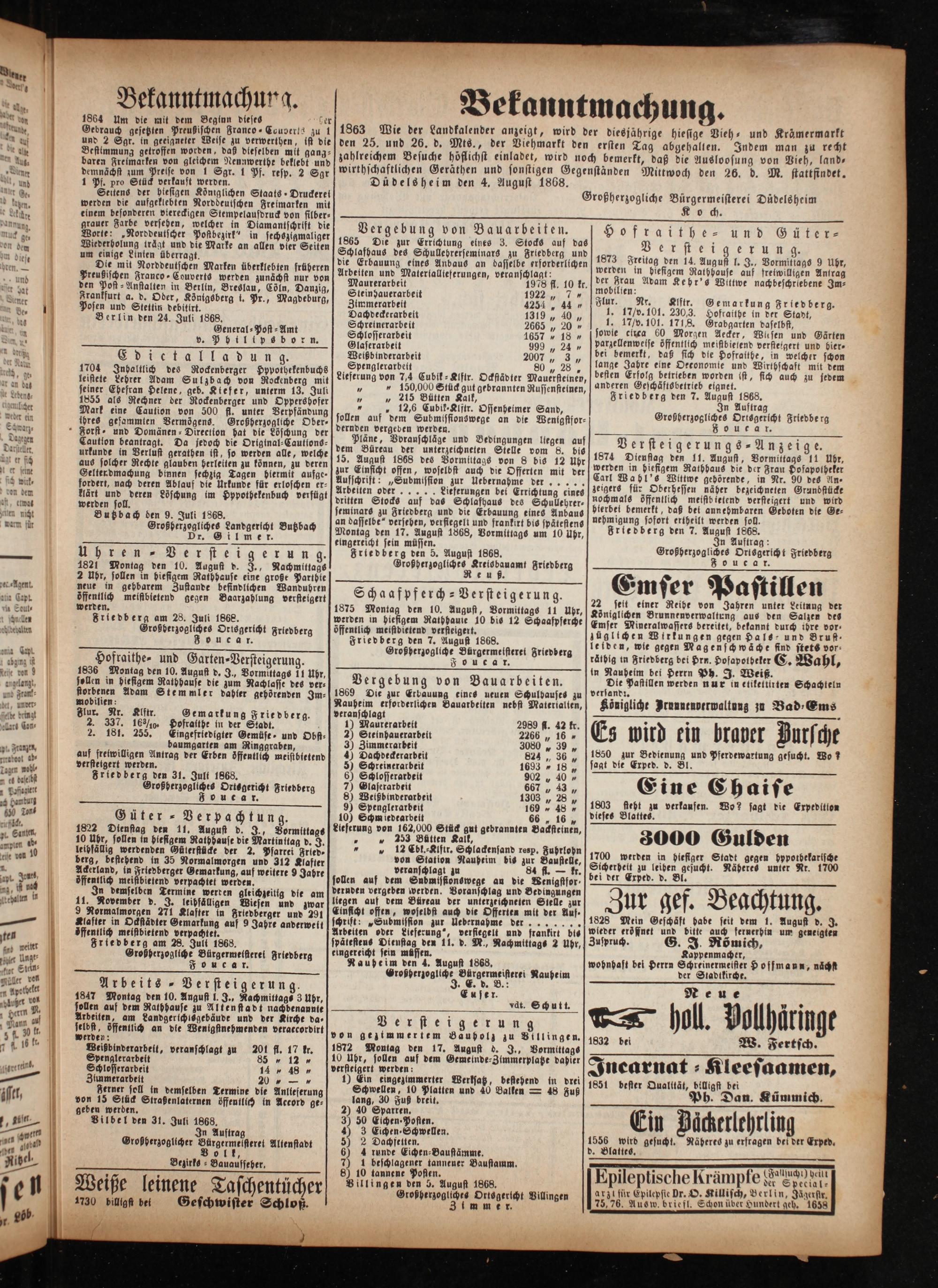 geben werden. Vilbel den 31. Juli 1868.