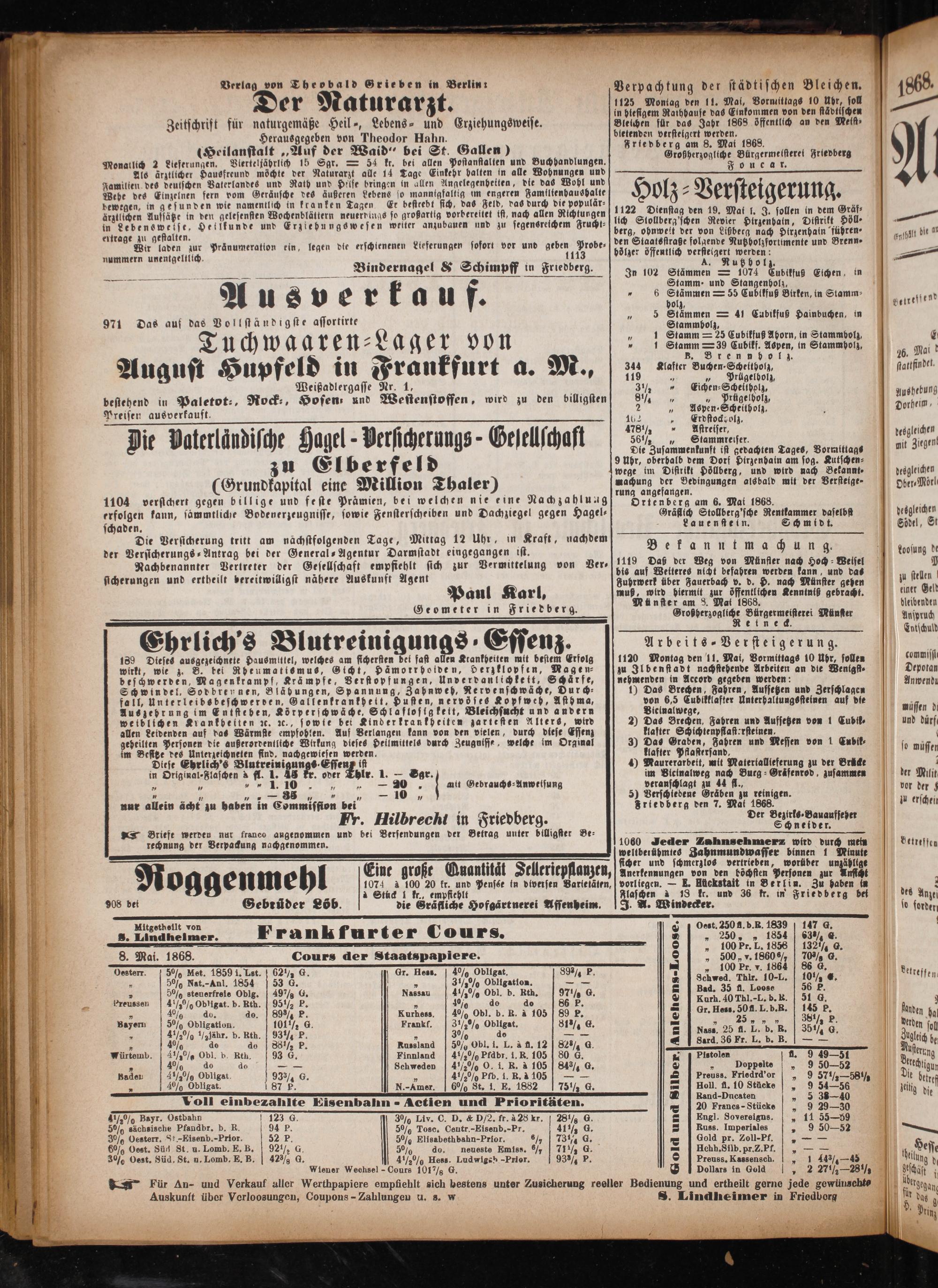 1125 Montag den 11. Mal, Vormittags 10 Uhr, soll in hiesigem Rathhause das Einkommen von den städilschen Bleichen für das Jahr 1868 öffentlich an den Meist⸗ bletenden versteigert werden. Friedberg am 8. Mai 1868. Großherzogliche Bürgermelsterel Friedberg Fouc ar.