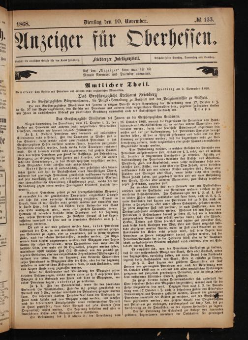 Betreffend: Den Verkehr mit Petroleum und anderen leicht entzündlichen Mineralölen. Das Großherzogliche Kreisamt Friedberg an die Großherzoglichen Bürgermeistereien, die Polizei⸗Verwaltung zu Nauheim und den Polizeicommissär zu Wickstadt. Die von Großherzoglichem Ministerium des Innern in obigem Betreffe wegen Anwendung der Verordnung vom 17. October d. J. in Nr. 57 des Regierungsblattes, den Verkehr mit Petroleum und anderen leicht entzündlichen Mineralölen betr., gegebene Instruction theilen