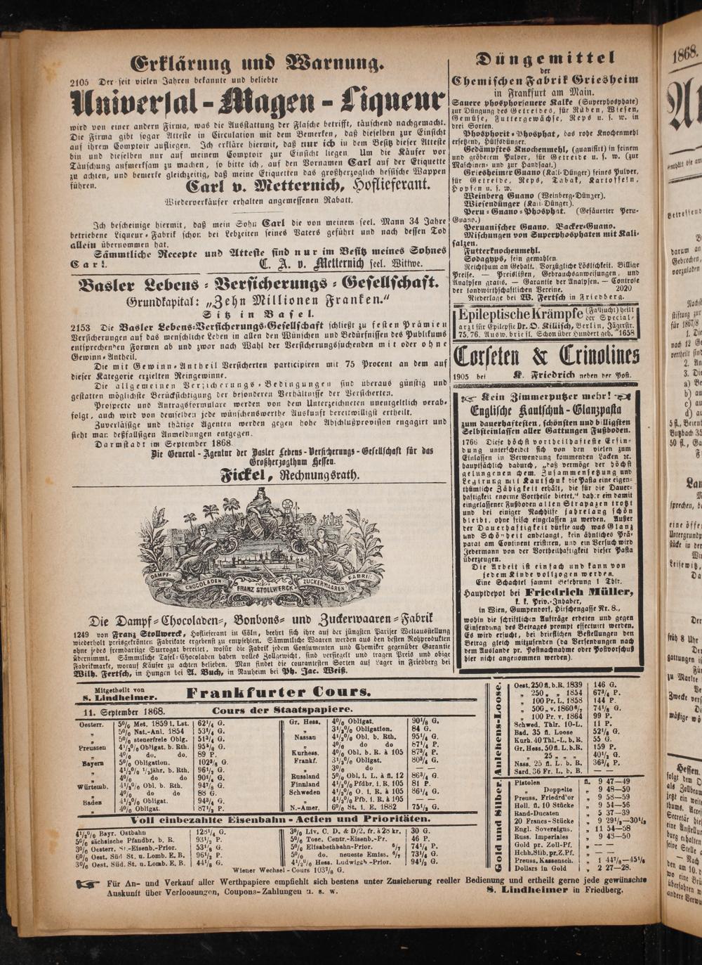 11. September 1868. Cours der Staatspapiere.