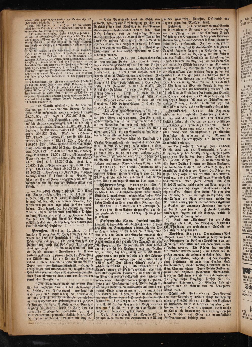 Schweiz. Das permanente Central-Comite der internationalen Friedens und Freiheits-Liga war am Pfingstfeste zu einer Conferenz Behufs Feststellung des Programms für die zweite General- Versammlung, die im September in Bern zusammen⸗ treten soll, versammelt. In dem aufgestellten Programm schlägt das Central⸗Comite dem zweiten Congreß folgende Fragen zur Besprechung vor: „1) Welches sind in Beziehung auf den Frieden und die Freiheit die Vortheile der Aufhebung der stehenden Armeen im Gegensatze zu den Vortheilen des nationalen Milizsystems oder einer allgemeinen Entwaffnung? 2) Welches sind die Beziehungen der ökonomischen oder socialen Frage zu der des Friedens und der Freiheit? 3) Welches sind in Bezug auf den Frieden und die Freiheit die Vor theile der Trennung der Kirche von dem Staate? 4) Wie kann das Föderativ⸗Prinzip in den ver⸗ schiedenen Ländern zur Anwendung kommen? und 5) wie kann die Verfassung der vereinigten Staaten von Europa beschaffen sein?“ Auger diesen officiell vorgelegten Fragen soll auch die Diskussion per- sönlicher Anträge, welche im Voraus schriftlich eingegeben werden, auf dem Congresse gestattet sein. „Frankreich. Paris. Die Regierung wird, um die französischen Interessen zu wahren, dic österreichischen Fonds aus dem Courszettel streichen lassen, ohne darum die guten politischen Beziehungen zu Oesterreich zu alteriren.— Nach ⸗ richten aus Luxemburg melden, daß kürzlich da⸗ selbst verschiedene Manifestationen zu Gunsten Frankreichs stattgefunden hätten. Namentlich wurde durch Maueranschläge die Annexion an Frankreich verlangt.