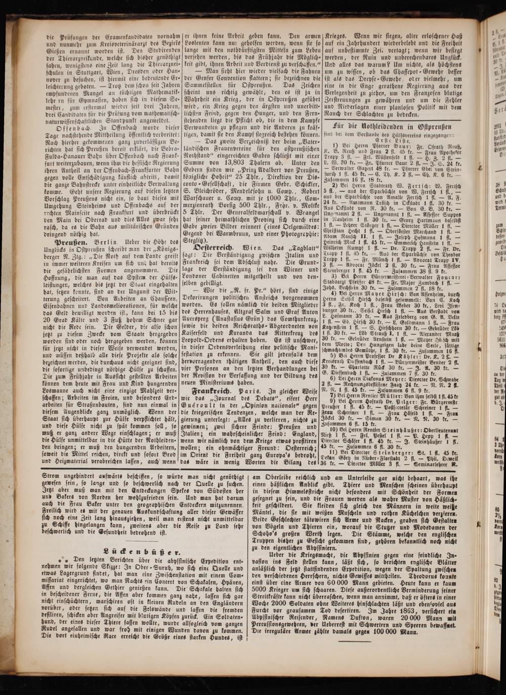 Ueber die Kriegsmacht, die Abyssinien gegen eine feindliche In⸗ vasion ins Feld stellen kann, läßt sich, so berichten englische Blätter anläßlich der jetzt stattfindenden Expedition, wegen der Spaltung zwischen den verschiedenen Herrschern, nichts Gewisses mittheilen. Theodorus konnte einst über eine Armee von 60 000 Mann gebieten. Heute kann er kaum 5000 Krieger um sich schaaren. Diese außerordentliche Verminderung seiner Streitkräfte kann nicht überraschen, wenn man annimmt, daß er öfters in einer Woche 2000 Soldaten obne Weiteres hinschlachten läßt und ebensoviel aus Furcht vor grausamem Tod desertiren. Im Jahre 1863, versichert ein Abyssinischer Reisender, Namens Dufton, waren 20000 Mann mlt Percussionsgewehren, der Ueberrest mit Schwertern und Speeren bewassatt. Die irreguläre Armee zählte damals gegen 100 000 Mann.