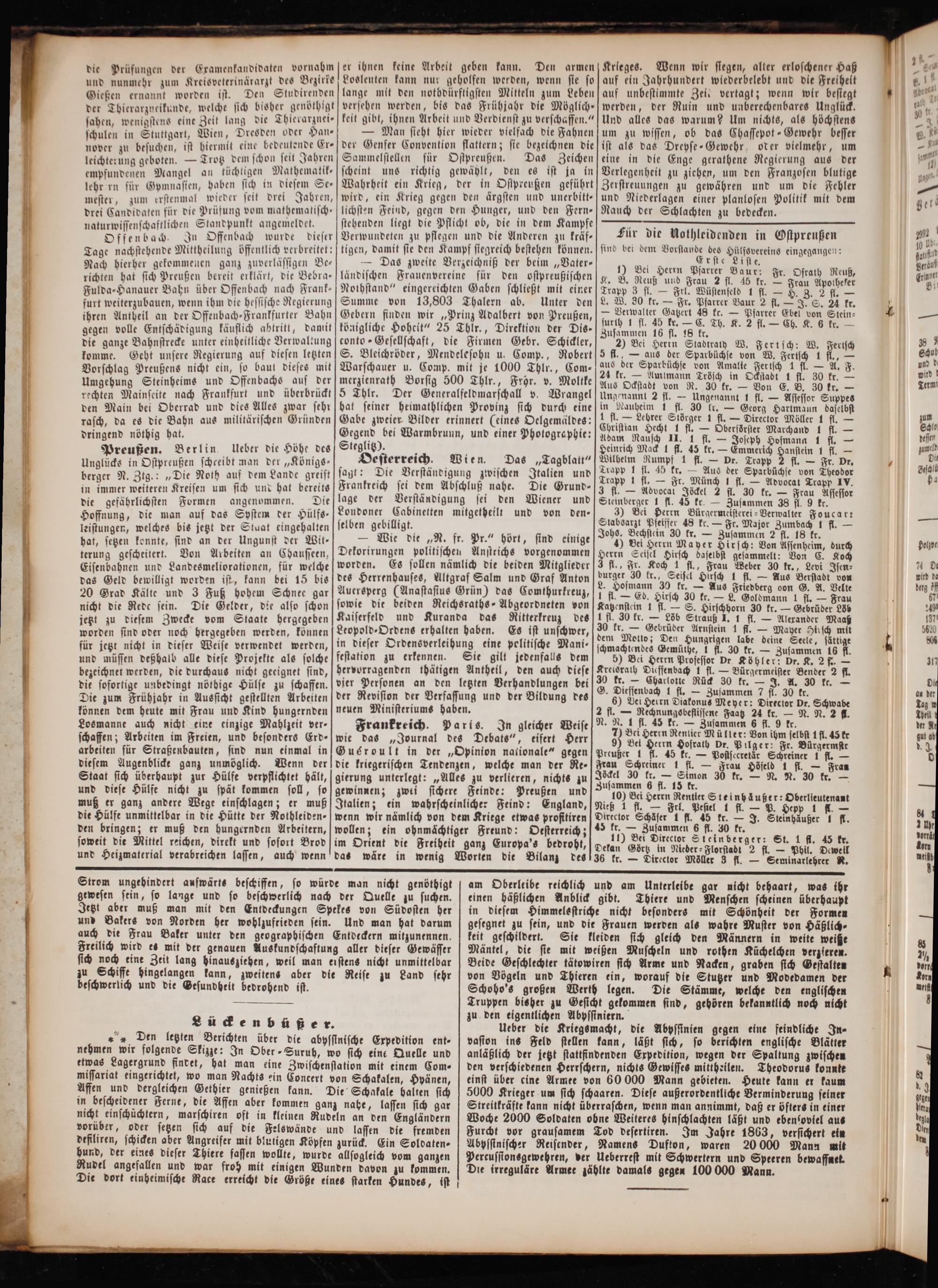 — Das zweite Verzeichniß der beim„Vater— ländischen Frauenvereine für den ostpreußischen Nothstand“ eingereichten Gaben schließt mit einer Summe von 13,803 Thalern ab. Unter den Gebern finden wir„Prinz Adalbert von Preußen, königliche Hoheit“ 25 Thlr., Direktion der Dis— conto-Gesellschaft, die Firmen Gebr. Schickler, S. Bleichröder, Mendelesohn u. Comp., Robert Warschauer u. Comp. mit je 1000 Thlr., Com- merzienrath Borsig 500 Thlr., Frör. v. Moltke 5 Thlr. Der Generalfeldmarschall v. Wrangel bat seiner heimathlichen Provinz sich durch eine Gabe zweier Bilder erinnert(eines Oelgemäldes: Gegend bei Warmbrunn, und einer Photographie: Steglitz).