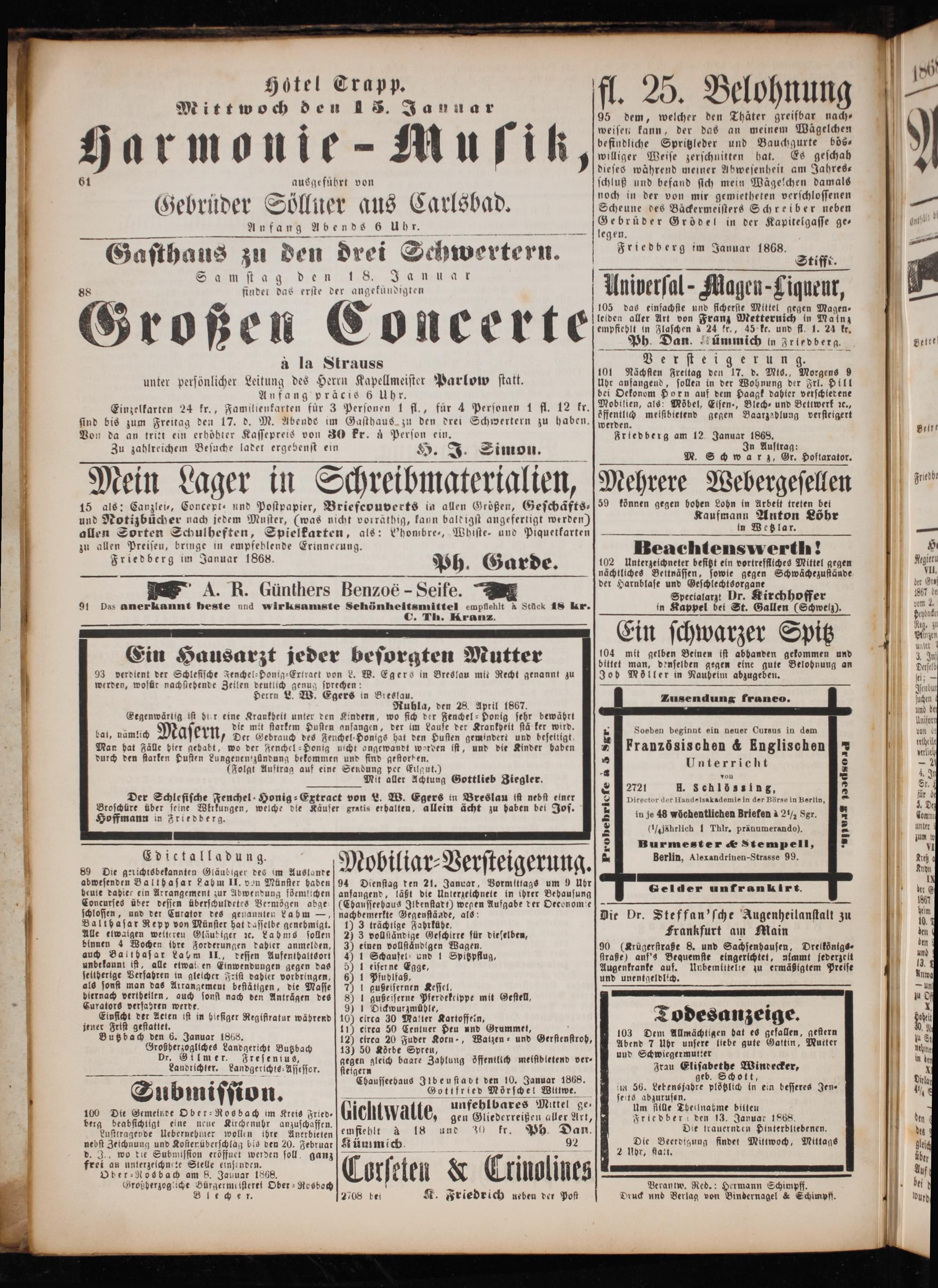 N e 101 Nächsten Freitag den 17. d. Mis., Morgens 9 Uhr aufangend, sollen in der Wohnung der Frl. Dill bei Oekonom Horn auf dem Haagk dahter verschled ene Mobilien, als: Möbel, Elsen⸗, Blech- und Bettwerk ꝛc., öffentlich meisibietend gegen Baarzablung versteigert werden. Friedberg am 12. Januar 1868. In Auftrag: M. Schwarz, Gr. Hoftaxator.