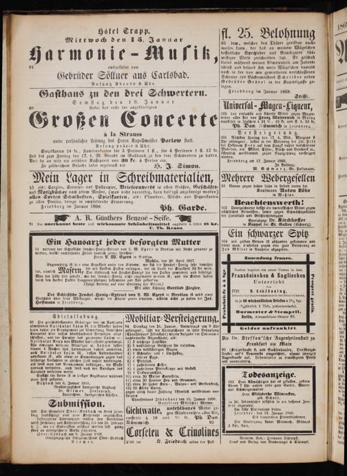 a la Strauss unter persönlicher Leitung des Herrn Kapellmeister Parlow statt. Anfang präcis 6 Uhr. Einzelkarten 24 kr., Familienkarten für 3 Personen 1 fl., sind bis zum Freitag den 17. d. M. Abende im Gasthaus. zu den drei Schwertern zu haben. Von da an tritt ein erhöhter Kassepreis von 80 kr. Zu zahlreichem Besuche ladet ergebenst ein