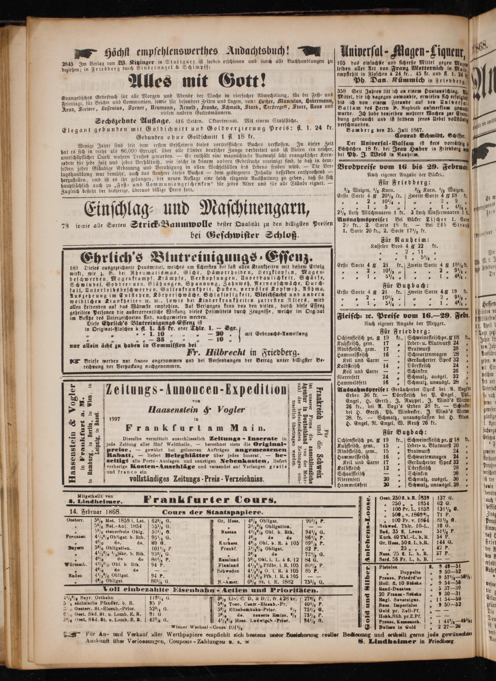2 7 1.. 5 ö Du 0 1 Ehrlich's Blutreinigungs⸗Essenz. N e ee U 189 Dieses ausgezeichnete Hausmittel, welches am fichersten dei fast allen Krankheiten mit bestem Erfolg Ersie Sorte 4 8 215 kr. Zweite Sorte 4 8 187%. 1 Ubetun, wirkt, wie z. B. bei Rheumatismus, Gicht, Hämorrhoiden, derzklopfen, Magen⸗. 2, 10½„„.„ die beschwerden, Magenkrampf, Krämpfe, Verstopfungen, Unverdaulichkeit, Schärfe,„„ PN„*„% Schwindel. Sodbreynen, Bläd ungen, Spannung, Zahnweh, Nervenschwäche, Durch⸗ Für Butzbach: fall, Unterleibsbeschwerden, Gallenkrankheit. Husten, nervöses Kopfweh, Asthma, Erste Sorte 4 21 kr. Iweit 8 e 48 19 6 Auszebrung im Entsteben, Körperschwäche, Schlaflostakelt, Bleichsucht und andern oste* 8 100 r. Zweite Sor 2 90% 1 weiblichen Krankbelten ic. ꝛc., sowie bei Kinderkrankheiten zartesten Alters, wird* 3 4* 1 5 4% J allen Leidenden auf das Wärmsie. Auf 2 kann von den 4 durch diese Essenz„„. 15„„„ 7 Hessen ehtilten Personen die außerordentliche Wirkung dieses Heilmittels durch Zeugnisse, welche im Orginal 5 5 länder ve 12— Unterzeichneten find. nachgewiesen werden. Fleisch⸗ ꝛc. Preise vom 16.—29. Feb slärste Diese Ehrlich's Ar ist Nach eigener Angabe der Metzger. 1. Ml in Original⸗Flaschen à fl. 1. 43 kr. oder Thlr. 1.— Sgr. 1 iedb g 11. W 5 5„ mit Gebrauchs⸗Anwelsung Für Friedberg:: Tagt ug 5 ee eee 1 Ochsenfleisch pr. 8 19 kr., Schweinefleisch pr. Z 18 b Jahn nur allein ächt zu haben in Commission bei Kuhfleisch, gem. 11„ Leber⸗ u. Blutwurst 24. von geh Fr. Hilbrechi in Friedber eee e 2 iin 1 5 9· Hammelfleisch 16 Schwartenmagen 28„ Autführt Briefe werden nut franco angenommen und bei Versendungen der Betrag unter dilligster Be⸗ Keil und Carre—„ Geräucherter Speck 32, gehen, rechnung der Verpackung nachgenommen. Kalblleisch 14„ Doörrfleisch 24 11 Em Keil und Carre—„ Schinken 1 10 Nierenfett 24„ Schmalz, ausgel. 32 delchem 2 5 8 N 2 22 Hammelsfett 16„ Schmalz, unausgl. 28 d und 2 5 J E 1 II I 8 8 2 1 III 0 I C C I 9 5 1 b 9 0 1 1 1 0 3 12 Ausnahmspreise: Geräucherter Speck bei A. Vogel Unlersuc Do 228 Erben 36 kr.— Oörrfleisch bei P. Engel, Phll, te nach 8 ron 3285 E 9 8 O. Gerth, J. e 2. b 5. 2 2828 0 kr., bei A. Vogt's Erben 28 kr.— in N 7 3 2 Haasensiein ꝙ Vogler 5499 bei H. Cerih, Pb. Windecer, J. Winde Dun bun S 1 3 1997 in 22883* 28. fr.— Schmalz, 3 bei H. Blun piunsigt 2382 2 82S 8 H. Engel, N. Engel, W. Reuß 26 kr.. Ayr 3 3 Frankfurt am Main. 3 2 5 Für Butz bach:— 1 Dieselbe vermittelt ausschliesslich Zeltungs- Inserate in 38 5 5 1 5 4 tees 2 2 2 2 bea. Zeitung aller fünf Welttheile,— berechnet stets die Original- E Ae 5. De 1* Scher. Bu N 5 I.*—— ˙·= FFF Rinofleisch, gem, 15„ Bratwurst 24„ neige S 5 iefert Beleghlätter über jedes Inserat.— be- 38 3 Hammelfleisch 16„ Schwartenmagen 24„ Daband 5— seitigt alle Porto- Auslagen und sonstigen Nebenkosten, liefert 8 S 2. 8. Keil und Carre 17 Geräucherter Speck 32„ dan 2 8 vorherige Kosten-Ansehläge und versendet auf Verlangen gratis 8 5 8 4 Kal bfleisch 12 8 Dörrfleisch 28 f Prußen — 8 und franco ein E f See 4 derschied 3 2. 2 2 3 S- Schaaffleisch—„ Schinken 5 schie 3 vollständiges Zeitungs- Preis- Verzeichniss. 5 Nierensett 20„ Schmalz, ausgel. 0 i der 11 Hammelsfett 20„ Schmalz, unausgel. 8„ sonit bereite Mitgetheilt von 0 2. Innerer: Frankfurter Cours. Kerne ug *—** e 14. Februar 1868. Cours der Staatspapiere. 8— 8 189%*—- Oesterr. 5% Met. 1859 f. Lst. 62 G. Gr. Hess. 4% Obligat. 9057 P—„ 100 Pr. v. 1864 81½ 6. Preuß 8 5% Nat.-Anl. 1854 55½ G. ü 8 3½% Obligation.—— Schwed. Thlr. 10-L. 10 6. fimnt — 5% steuerfreie Oblg. 50½ 0 Nassau 4½% Obl. b. Rtk. 94½ G. Bad. 35 fl. Loose 51½ F. f Preussen 4½% Obligat. b. Rth. 95½ 6 5 4% de. 4% 86½ P 2 J Korb. 40 Tul.-L. b. k. 54 F. daß f „ 4% do. do. 89 6. Kurhess. 4% Obl. b. k. à 105 89% f 5 or. Hess. 50 fl. L. b. R. 144 d. Friel Bayern 5% Obligation. 101½ P. Frankf. 3½9% Obligat. 82 P. 2 F( der R 3 4½% ½ Jahr. d. Rth. 93 G. 2 30% de 72½ 0 2 Nass. 25 fl. L. b. R. 37 P„un 7 4% 40 do 83½ P Russland 50% Obl. i. L. à fl. 1284 d. A ard. 36 Fr. L. b. 8B.: Würtemb. 4½% Obl. d. th. 94 P. Finnland 4½% Pfdbr. i. R. 105 80¼ P ele 1 775 trhebl 5 4% 4% 4. 2 Schweden 4½1% O. l. k. 4 10585 F. 5 4 9 50—52 Ruhr Baden 1% Obliget. 94 r. 5 4½0% Pfb. I. R. 4 105—— en 8 5 57/58 ö 1 5 2. N 865 N.-Aner. 60% St. I. E. 1882 75% d. oll. fl. 10 Sake„ 9 545 vistn oll einbezanite Eisenbahn- Aetien und Priorickten.* n„ FN de g 4½% Bayr. Ostbahn 119¼½ 6. 3% LIV. C. D.& D/. fr. à 28 kr. 27% P.— Ru e f 11 54—58 Eilar 5 h sächsische Pfandbr. b. R. 1 FP. 5% Tose. Ceutr.-Eisenb.-Pr 40% P 7 1 r—52 3 2 0. ö Pr. 8 P. Ress. Imperiales„ 9 50—5 grün 3% Ossterr. St.-Eisenb.-Prior. 52 86. 5% Elisabethbahn-Prior.% 75½ d. eln e pr 3 Di 6% Ost. Sad. St. u. Lomb. E. B. 91 6 5% de. neueste Kaige. ½ 73% F. I Ia Bid N N ie 3% Ost. Süd. St. u. Lomb. E. B. 42 6. 4½j% Hess. Lud wiged-Prier. 94½ d. n Fee 0 1 444% Den wieuer Wechsel- Oours 101 ½ op. ne ia Od„ 2 2728 u