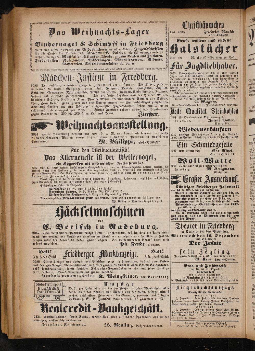 von 2— 2 8 2 2 0 Bindernagel& Schimpff in Friedberg bietet eine reiche Auswabl von Bilderbüchern in allen Arten, Jugendschriften für alle Stufen des Kindesalters, Prachtwerke, Bücher, die ssch vorzugsweise zu Geschenken eignen, Musikalien, Atlanten, Vorlagen zum Malen und Zeichnen, Farbenkasten, Notizbücher, Bilderbogen, Modellireartons, Albums, Papeterien, Schreibmaterialien ꝛc. ꝛc. ꝛc.