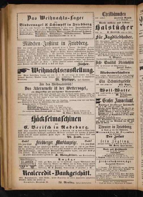 3086 Einem hiesigen und auswärtigen Publikum zeige ich hiermit an, daß ich zum Ersten⸗ mal den Friedberger Weihnachtsmarkt mit einer großen Auswahl in allen Sorten Spielwaaren, nebst Hausbaltungs-, sowie sonstigen Gebrauchs⸗Gegenständen beziehe, und jedes Stuck zu 3 kr. verkaufe. Stand Markiplatz mit Firma versehen.