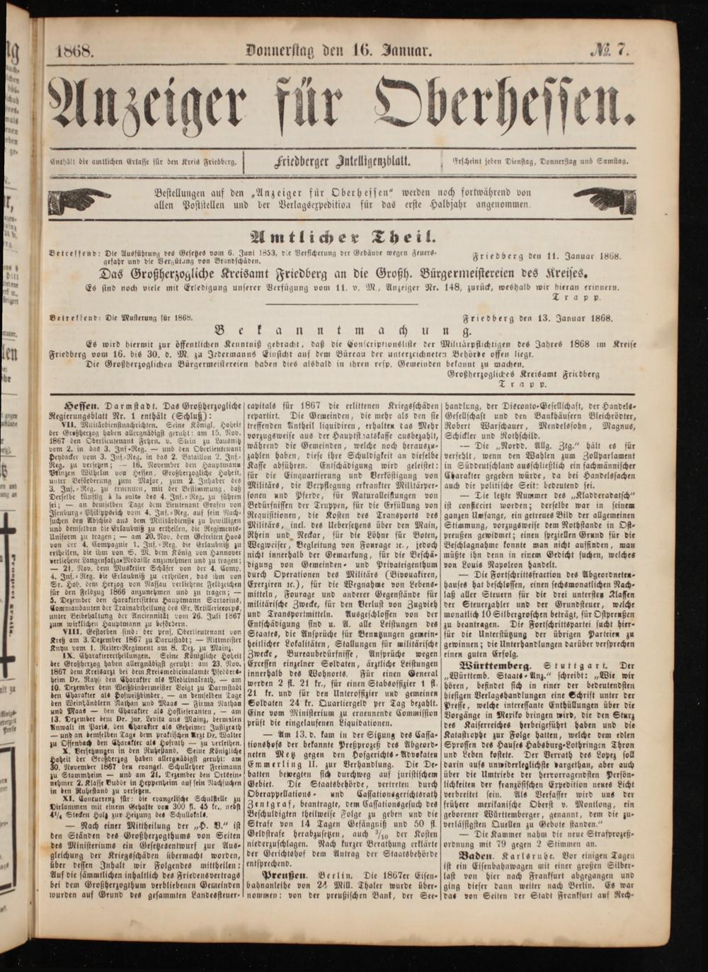 Bestellungen auf den„Anzeiger für Oberhessen“ werden noch fortwährend von allen Poststellen und der Verlagsexpedition