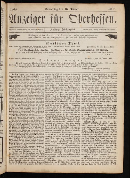 Es wird hiermit zur öffentlichen Keuntniß gebracht, daß die Eonscriptionsliste der Militärpflichtigen des Jahres 1868 im Kreise Friedberg vom 16. bis 30. d. M. zu Jedermanns Einsicht auf dem Bürcau der unterzeichneten Behörde offen liegt. Die Großherzoglichen Bürgermeistereien haben dies alsbald in ihren resp. Gemeinden bekannt zu machen.