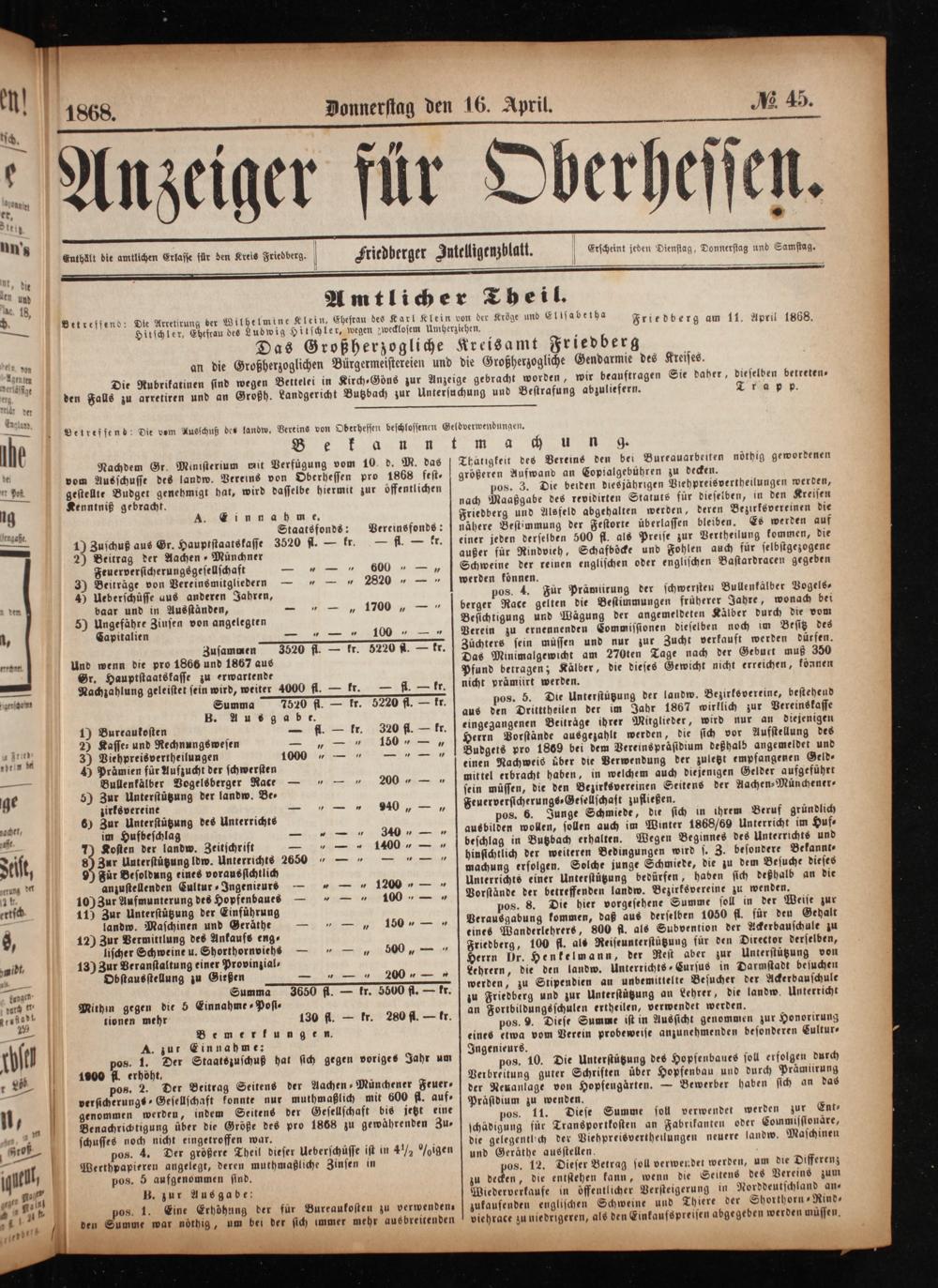 Nachdem Gr. Ministerium mit Verfügung vom 10. d. M. das vom Ausschusse des landw. Vereins von Oberhessen pro 1868 fest⸗ gestellte Budget genehmigt hat, wird dasselbe hiermit zur öffentlichen Kenntniß gebracht.
