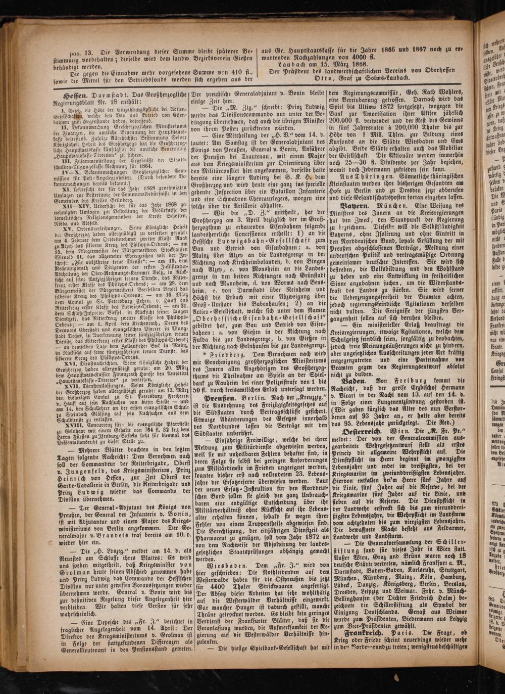— Die„H. Losztg.“ meldet am 14. d. als Neuestes am Schlusse ihres Blattes: Es wird uns soeben mitgetheilt, daß Kriegsminister von Grolman heute seinen Abschied genommen habe und Prinz Ludwig das Commando der Hessischen Division nur unter gewissen Voraussetzungen wieder übernehmen werde. General v. Bonin wird bis zur definitiven Regelung dieser Angelegenheit hier verbleiben. Wir halten diese Version für sehr wahrscheinlich.