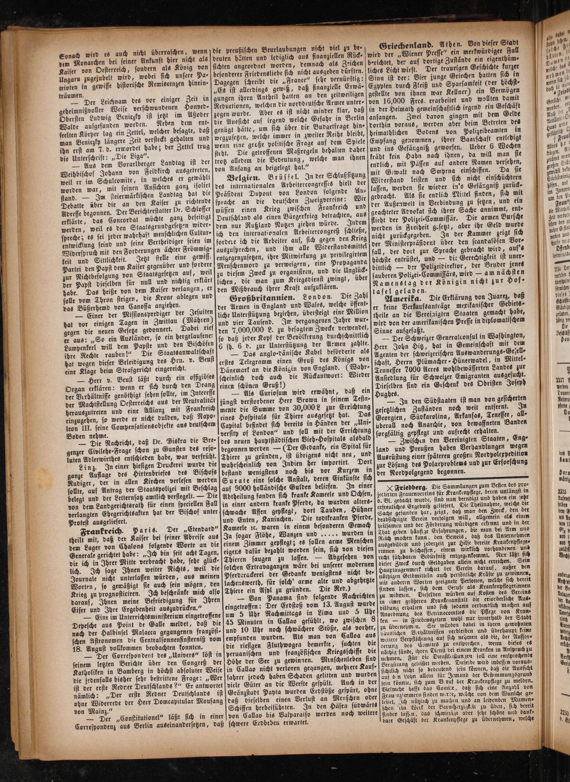 — Aus dem Vorarlberger Landtag ist der Weihbischof Johann von Feldkirch ausgetreten, weil er im Schulcomite, in welches er gewählt worden war, mit seinen Ansichten ganz isolirt stand.— Im steiermärkischen Landtag hat die Debatte über die an den Kaiser zu richtende Adresse begonnen. Der Berichterstatter Dr. Schlosser erklärte, das Concordat möchte ganz beseitigt werden, weil es den Staatsgrundgesetzen wider ⸗ spreche; es sei jeder wahrhaft menschlichen Cultur⸗ entwicklung feind und seine Vertheidiger seien im Widerspruch mit den Forderungen ächter Frömmig⸗ keit und Sittlichkeit. Jetzt stelle eine gewiss. Partei den Papst dem Kaiser gegenüber und fordere zur Nichtbefolgung von Staatsgesetzen auf, weil der Papst dieselben für null und nichtig erklärt habe. Das heiße von dem Kaiser verlangen, er solle vom Thron steigen, die Krone ablegen und das Büßerhemd von Canossa anziehen.