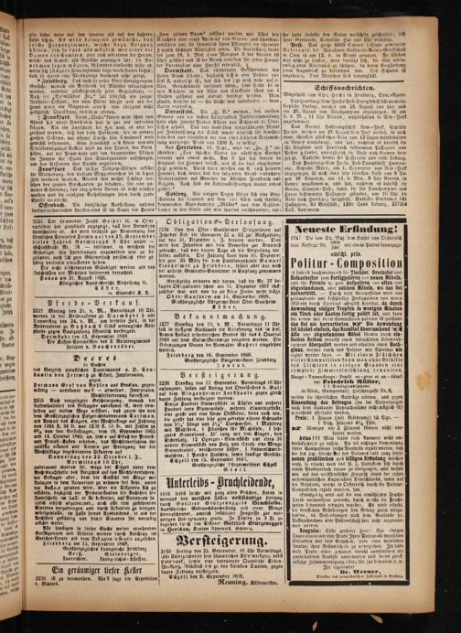 Aviso 11] Man bittet diese Annonce nicht un⸗ berücksichtigt zu lassen. Da bei richtiger Anwendung dieser Composition solche Vortheile erzielt werden, daß die bis jetzt übliche Art des Polirens bald ganz dieser neuen praktischen und billigen Erfindung weichen muß, so ersucht man das P. T. Publikum sich durch einen Probeversuch davon zu überzeugen, und weisen wir auf das veröffentlichte Zeugniß eines der ersten wissenschaftlichen Kapacitäten Deuischlands, sowie auf die Resul tate, welche in Oesterreich durch die Politur⸗ Compositien erzielt wurden, hin.