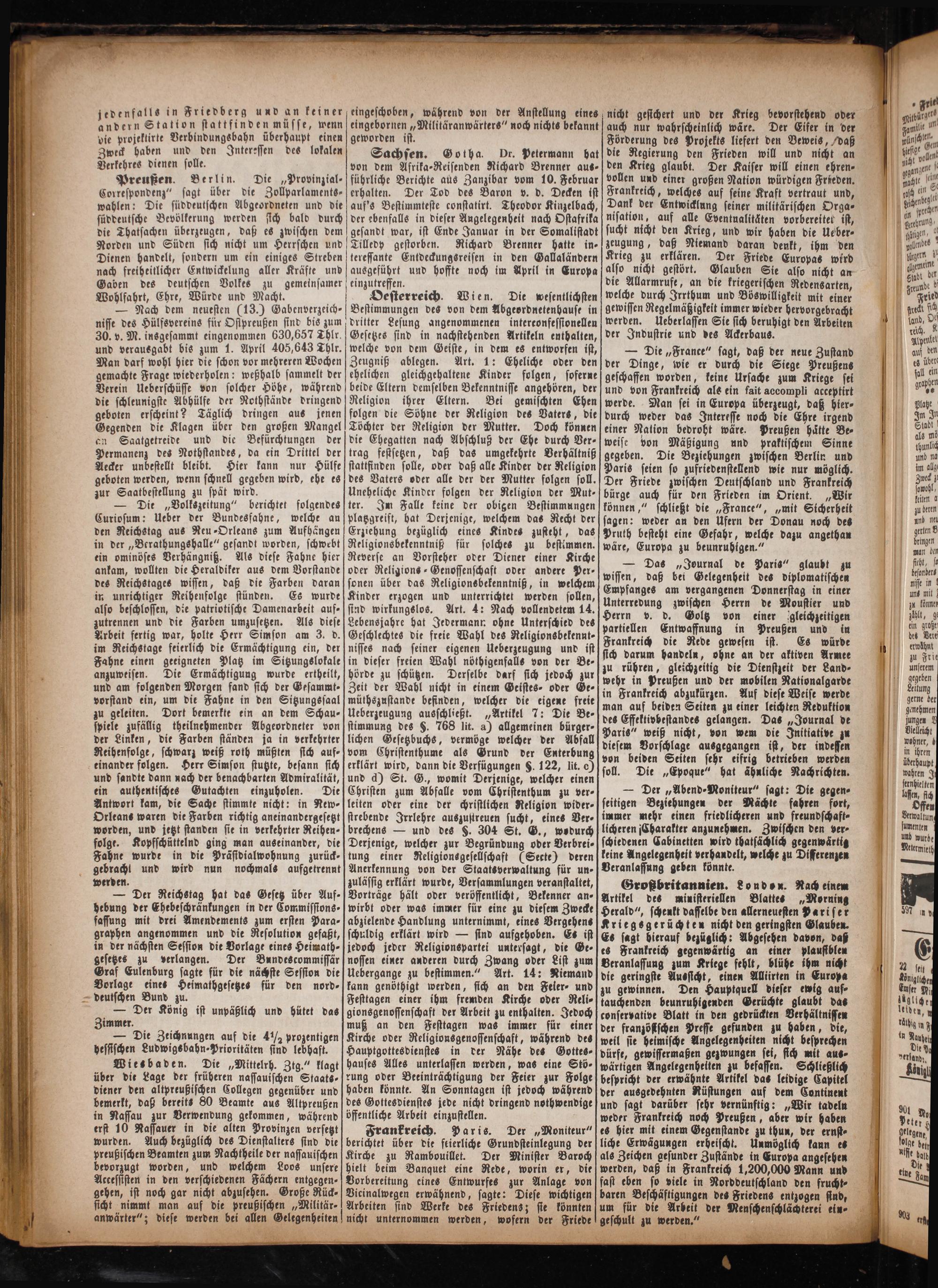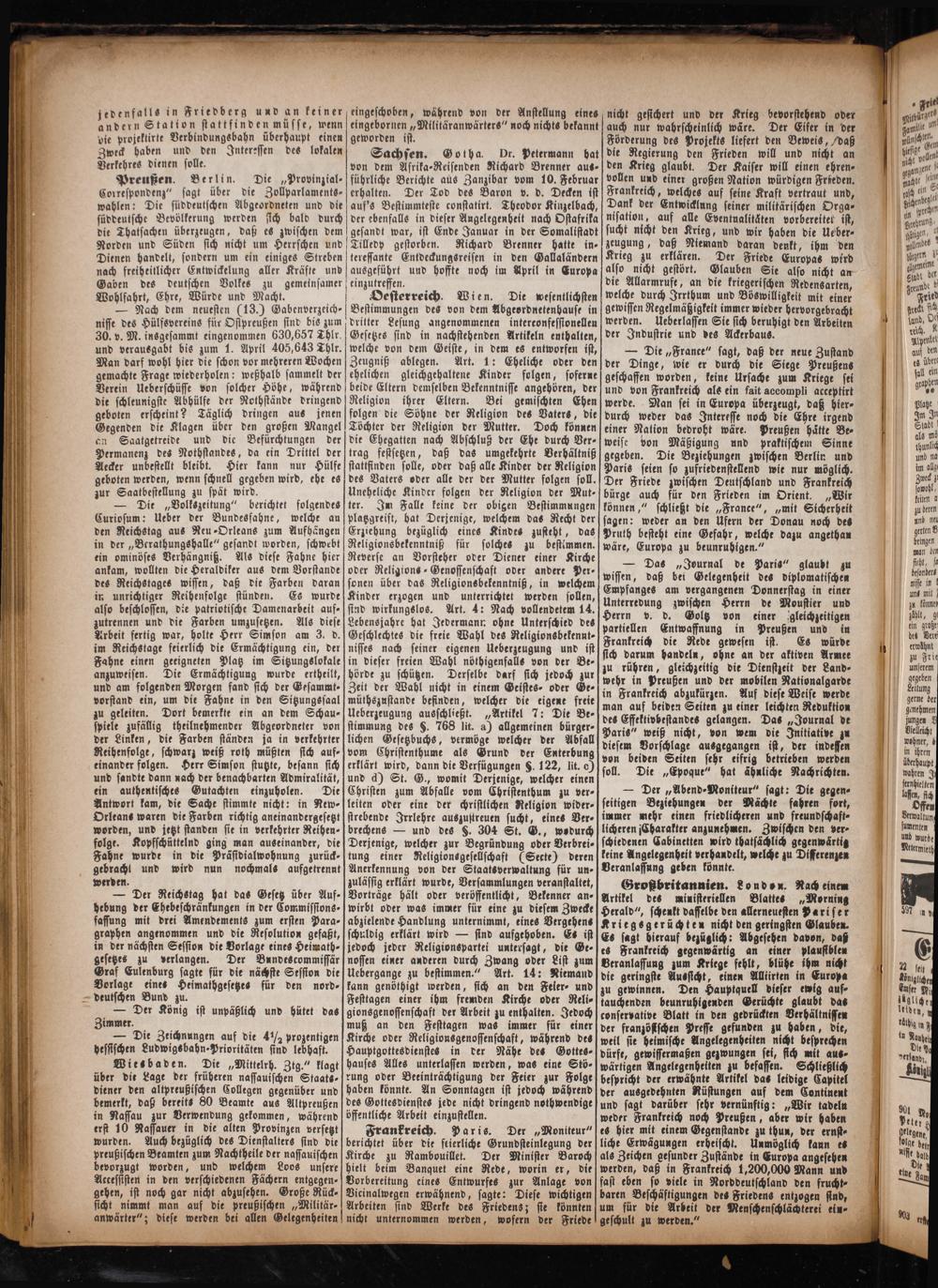 Sachsen. Gotha. Dr. Petermann hat von dem Afrika⸗Reisenden Richard Brenner aus⸗ führliche Berichte aus Zanzibar vom 10. Februar erhalten. Der Tod des Baron v. d. Decken ist auf's Bestimmteste constatirt. Theodor Kinzelbach, der ebenfalls in dieser Angelegenheit nach Ostafrika gesandt war, ist Ende Januar in der Somalistadt Tilledo gestorben. Richard Brenner hatte in⸗ teressante Entdeckungsreisen in den Gallaländern ausgeführt und hoffte noch im April in Europa einzutreffen.