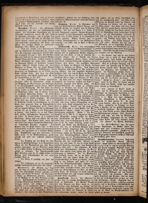 Oesterreich. Wien. Die wesentlichsten Bestimmungen des von dem Abgeordnetenhause in dritter Lesung angenommenen interconfesstonellen Gesetzes sind in nachstehenden Artikeln enthalten, welche von dem Geiste, in dem es entworfen ist, Zeugniß ablegen. Art. 1: Eheliche oder den ehelichen gleichgehaltene Kinder folgen, soferne beide Eltern demselben Bekenntnisse angehören, der Religion ihrer Eltern. Bei gemischten Ehen folgen die Söhne der Religion des Vaters, die Töchter der Religion der Mutter. Doch können die Ehegatten nach Abschluß der Ehe durch Ver⸗— trag festsetzen, daß das umgekehrte Verhältniß stattfinden solle, oder daß alle Kinder der Religion des Vaters oder alle der der Mutter folgen soll. Uneheliche Kinder folgen der Religion der Mut— ter. Im Falle keine der obigen Bestimmungen platzgreift, hat Derjenige, welchem das Recht der Erziehung bezüglich eines Kindes zusteht, das Religionsbekenntniß für solches zu bestimmen. Reverse an Vorsteher oder Diener einer Kirche oder Religions⸗Genossenschaft oder andere Per- sonen über das Religionsbekenntniß, in welchem Kinder erzogen und unterrichtet werden sollen, sind wirkungslos. Art. 4: Nach vollendetem 14. Lebensjahre hat Jedermann ohne Unterschied des Geschlechtes die freie Wahl des Religionsbekennt⸗ nisses nach seiner eigenen Ueberzeugung und ist in dieser freien Wahl nöthigenfalls von der Be⸗ hörde zu schützen. Derselbe darf sich jedoch zur Zeit der Wahl nicht in einem Geistes⸗ oder Ge⸗ müthszustande befinden, welcher die eigene freie Ueberzeugung ausschließt.„Artikel 7: Die Be⸗ stimmung des§. 768 lit. a) allgemeinen bürger⸗ lichen Gesetzbuchs, vermöge welcher der Abfall vom Christenthume als Grund der Enterbung erklärt wird, dann die Verfügungen§. 122, lit. o) und d) St. G., womit Derjenige, welcher einen Christen zum Abfalle vom Christenthum zu ver⸗ leiten oder eine der christlichen Religion wider⸗ strebende Irrlehre auszustreuen sucht, eines Ver⸗ brechens— und des§. 304 St. G., wodurch Derjenige, welcher zur Begründung oder Verbrei⸗ tung einer Religionsgesellschaft(Secte) deren Anerkennung von der Staatsverwaltung für un⸗ zulässig erklärt wurde, Versammlungen veranstaltet, Vorträge hält oder veröffentlicht, Bekenner an⸗ wirbt oder was immer für eine zu diesem Zwecke abzielende Handlung unternimmt, eines Vergehens schuldig erklärt wird— sind aufgehoben. Es ist jedoch jeder Religionspartei untersagt, die Ge⸗ nossen einer anderen durch Zwang oder List zum Uebergange zu bestimmen.“ Art. 14: Niemand kann genöthigt werden, sich an den Feier⸗ und Festtagen einer ihm fremden Kirche oder Reli⸗ gionsgenossenschaft der Arbeit zu enthalten. Jedoch muß an den Festtagen was immer für einer Kirche oder Religionsgenossenschaft, während des Hauptgottesdienstes in der Nähe des Gottes- hauses Alles unterlassen werden, was eine Stö⸗ rung oder Beeinträchtigung der Feier zur Folge haben könnte. An Sonntagen ist jedoch während des Gottesdienstes jede nicht dringend nothwendige öffentliche Arbeit einzustellen.