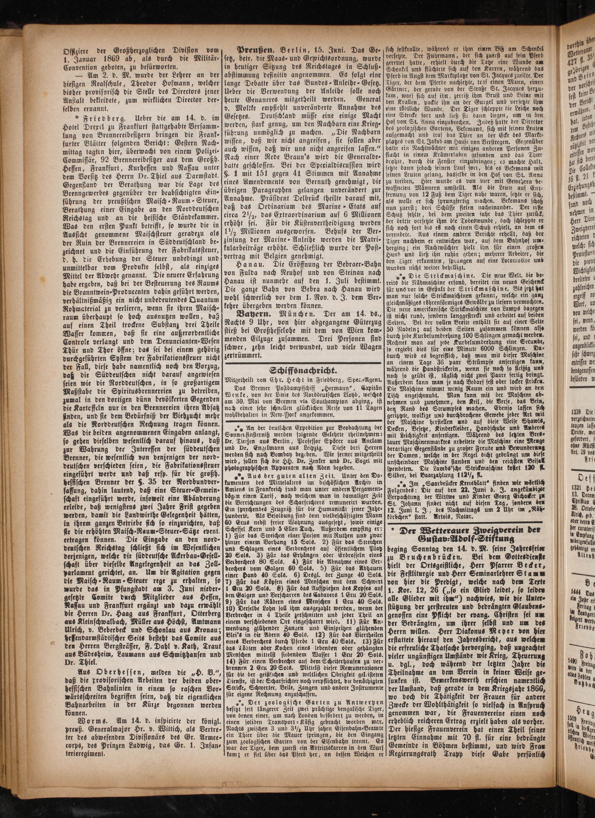 Schiffsnachricht. Mitgetheilt von Chr. Hecht in Friedberg, Spec.⸗Agent. Das Bremer Postdampsschiff„Hermann“, Capitän Wenke, von der Linie des Norddeulschen Lloyd, welches am 30. Mai von Bremen via Southampton abging, ist nach einer sehr schnellen glücklichen Reise von 11 Tagen wohlbehalten in NewYork angekommen.