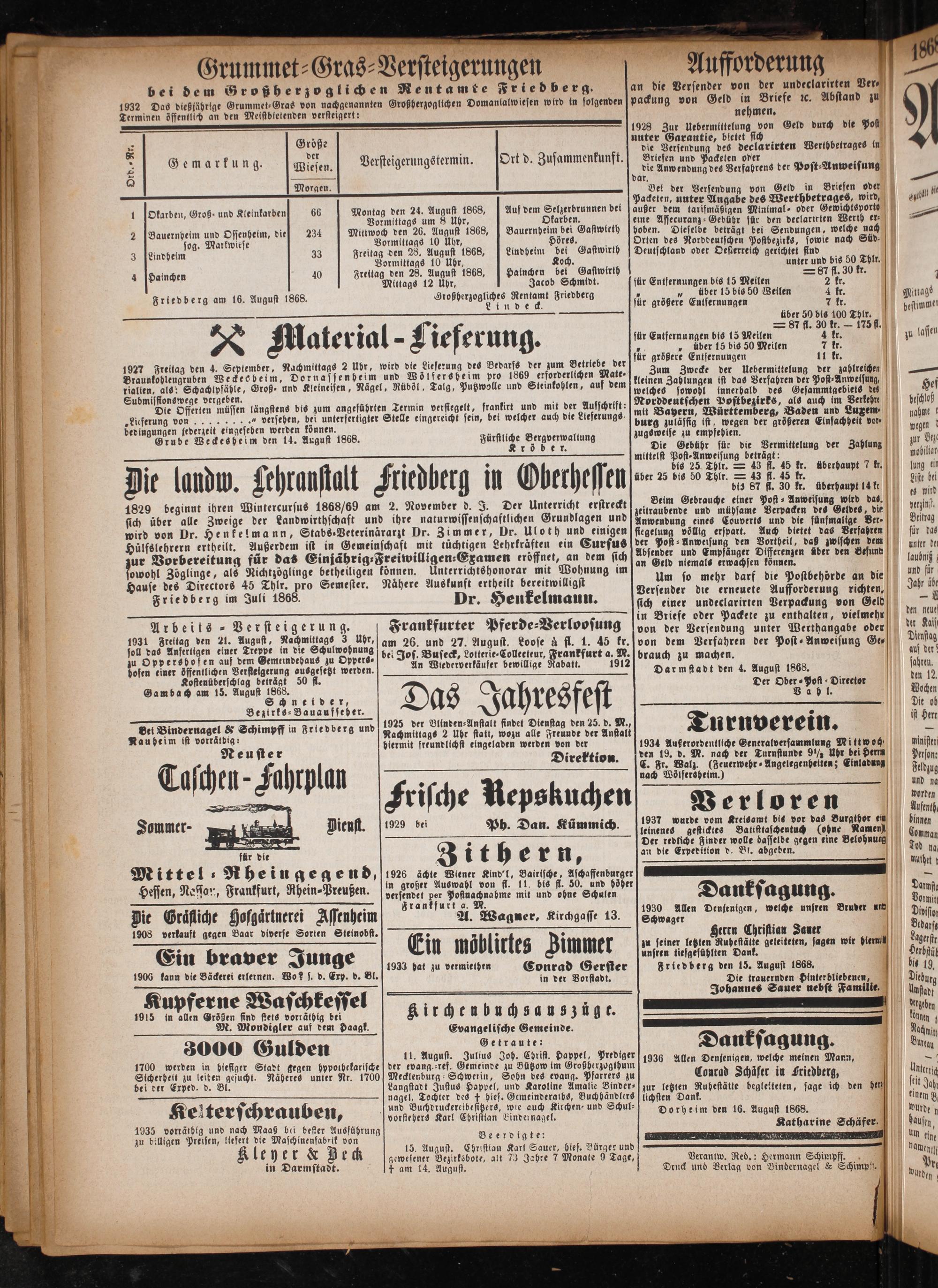 5 n 5 1 N* 3 0 5 e 1 5 e 225 f 2 4 g g 0 2 5 90 Grummet⸗Gras⸗Versteigerungen Aufforderung— N bei dem Großherzoglichen Rentamte Friedberg. an die Versender von der undeclarirten Ver 1. 1932 Das dieß jährige Grummet⸗Gras von nachgenannten Großherzoglichen Domantalwiesen wird in folgenden] packung von Geld in Briefe 1c. Abstand zu 5 Terminen öffentlich an den Meistbletenden versteigert: nehmen. 11 9— 1928 Zur Uebermittelung von Geld durch die Post( 5 1 Große unter Garantie, bletet sich 3 8 6 b 805 Berste lernen Ort d Zusammenkunft e e 15 1 Werthbetrages in 1* e markung. g ersteigerungstermin.. 0 0 riefen und Packeten oper l 1 8 b g Wiel 8 9 5 die Anwendung des Verfahrens der Post⸗Anweisung 7 * ar. 5 1 Morgen. 5 875 der 1 von 3 55 925 f 10 0 1 acketen, unter Angabe des Werthbetrages, wird, en 3 1[Okarben, Groß- und Kleinkarben 66 Na f 55 a Auf eee bei 8 aun Minimal- oder 0 1. 1 ormittags um r,. arben. eine ecuranz⸗Gebü ür den declartrten Werth en⸗ 1 5 2[Bauernheim 110 Ossenheim, dief 234 e 0 193 10 955 1868, ae Gastwieth 907 0 9 aa. 1 00 80 1 og. Markwiese ormitiag yr, res. f rten des Norddeutschen Postbezirks, sowie na d. 1 3 Sudhein 5 33 dreüreg due 10 fl 1868, Lindheim 105 Gastwirth] Deutschland oder Oesierreich gerichte sind bis 50 Töl Vormttta r,. unter und bi f. b ö 4[Hainchen 40 Freitag den 28. August 1868, Hainchen bel Gaftwirth 1 fl. 30 kr. 1 1 Mittags 12 Uhr, Jacob Schmidt. sür Entfernungen bis 15 7 2 kr. 1 9 2 g Gro ogliches Rentamt Friedber„ über 15 bis 50 Weilen 4 kr. Ittags ö Friedberg am 16. August 1868 ßherz 6105 8 Friedberg für größere Eee 9 5 11 f 1 7 N 925 0 30305 22785 1 5 8 1. r.— 175 fl. a f 0— für Entfernungen bis 15 Meilen 4 kr. u lasser 0 i 8 Ma er la Liefer ung. 11 115 21 15 bis 50 Meilen 7 5 f 1. l ir größere Entfernungen 11 kr. 1 1927 Freitag den 4. September, Nachmittags 2 Ubr, wird die Lieferung des Bedarfs der zum Betriebe der. * N ahn iebiengrad en Wedkeobeim, Dornassenheim und Wölfersheim pro 1869 erforderlichen Mate. Ka Zwecke der Uebermittelung der ia— C ö g rialien, als: Schachlpfähle, Groß- und Kleineisen, Nägel, Rüdöl, Talg, Putzwolle und Steinkohlen, auf dem ei labs da e e Hef 1 Submissionswege vergeben. l 0 1 Bie Offerten müssen längstens bis zum angeführten Termin versiegelt, frankirt und mit der Ausschrift: ee Postbezirks, als auch im Verkehre beschloß ö„Lieferung von„ versehen, bei unterfertigter Stelle eingereicht sein, bei welcher auch die Lieferungs⸗ mit Bayern, Württemberg, Baden und Luxem. fahne 1 dedingungen lederzeit eingeseben werden können. burg zulässig ißt ie der größeren Elnfachhelt vor, wiegen 1 Grube Weckesheim den 14. Angust 1868. Fürstliche Bergverwaltung zugeweise zu empfehlen. iu Bh 1 Kröber. Die Gebühr für die Vermittelung der Zahlung. 1 a f f u ker e e f f f. e e 1 5 86 lr.= 43 fl. 5 ethaupt 7 kr. lung ein 1— 1 1 Die landw. Lehranstalt Friedberg in Oberhessen. W e bene, 1. t 1829 beginnt ihren Wintercursus 1868/69 am 2. November d. J. Der Unterricht erstreckt e Beim Gebrauche einer Pot e Anweisung wied da. peil. 1 sich über alle Zweige der Landwirthschaft und ihre naturwissenschaftlichen Grundlagen und Aa 9 e e fa 927 1— 1 wird von Dr. Henkelma nun, Stabs- Veterinärarzt Dr. Zimmer, Dr. Uloth und einigen ssiegelung völlig erspart. Auch bietet das Verfahren für das 1 Hülfslehrern ertheilt. Außerdem ist in Gemeinschaft mit tüchtigen Lehrkräften ein Cursus] der Post⸗Anwersung den Vortheil, daß zwischen dem unter de 1 ur Vorbereitung für das Einjährig⸗Freiwilligen⸗Examen eröffnet, an dem sich 99 9 emule eee über den Besuns saubniß 1 owohl Zöglinge, als Nichtzöglinge betheiligen können. Unterrichtshonorar mit Wohnung im 1 e 5 5 und für 1 Hause des Directors 45 Thlr. pro Semester. Nähere Auskunft erteilt bereitwilligst Um so mehr darf die Postbehörde an die 940 ll Friedberg im Juli 1868. Dr Henkelmann Versender die erneuete Aufforderung richten,. 6 8 5 sich einer undeclarirten Verpackung von Geld 1 17 1 5 g 7 in Briefe oder Packete zu enthalten, vielmehr 1 Arbeits ⸗ 1 10 1 0 bun ge 4 Frankfurter Pferde⸗Verloosung von 9 5 Ba Fine Werthaugabe 595 der Ralf 1 1931 Freltag den 21. August, Nachmittags r, 4. 1 115 1 t e e de e eee 26. und 27. August. Loose à fl. 1. 45 kr. von dem Verfahren der Post⸗Anweisung Ge⸗ unsag 1 u Oppersbofen auf dem Gemeindehaus zu Oppers⸗ bei Jos. Buseck, Lolkerie⸗Eolleeteur, Frankfurt a, N. brauch zu machen. aud dur f 1 dosen einer e Nate 30 werden. An Wiederverkäufer bewillige Rabatt. 1912 Darmftadt den 4. August 1868. 10 1 Kostenüberschlag beträgt. 8 Di en 12. 1 Gambach am 15. August 555 5 Das Jahresfest Der 35 5 135 1 Waden 1 n e e r 10 Bezirts⸗Bauaufseber. 5 2 1 ö 0 7 f 1925 der Blinden⸗Anstalt findet Dienstag den 25. d. M. T N N 73 t eee in Friedberg und Nachmittags 2 Uhr statt, wozu alle Freunde der Anfall urnverein. 9 1 N hiermit freundlichst eingeladen werden von der 1934 Außerordentliche Generalversammlung Mittwoch minister 1 euster Direktion. den 19. d. M. nach der Turnssunde 9½ Uhr bei denn Peron N ö 1 C 15. 502 1 Ke ee Einladung Feldzug 1 5 1 lfers— 1 f Ell I I an 2 1 k 2 b und na N— 3 rische eps uchen Ver loren e N 25 5 I 0 1 ö 2 8 ö 1929 bei 5.; 1937 wurde vom Kreisomt bis vor das Burgthor en. bin 9 Sommer 9 itul. 5 Ph. Dan. Kümmich. leinenes gesticktes Batisttascheutuch(ohne Namen]— ö 1 55 2 Der redliche Finder wolle dasselbe gegen eine Belohnung 7 an 1 für die 3 1 t h 2 r n an die Expeditton d. Bi. abgeben. od na 1 2 2 0 9 mulhet l 41 Mittel⸗Rheingegend, bod, g e k- B 4% J0e Harze PPP 8 5 Aa in⸗ n großer Auswahl von fl. 11. bis fl. 50. und höher . Hessen, Nesson, Frankfurt, Rhein⸗Preußen. daz 0 Beech abme mi und ohne Schulen Danksagung. ban 4 7 5 5 8 Frankfurt a. M. 5 ami 9 Die Graͤfliche Hofgärtnerei Assenheim A. Wagner Kirchgasse 12. Sgwegr engen, weise een dee e e 10 1908 verkauft gegen Baar diverse Sorten Stelnobst. 2 7 7 Herrn Christian Janet galt 
