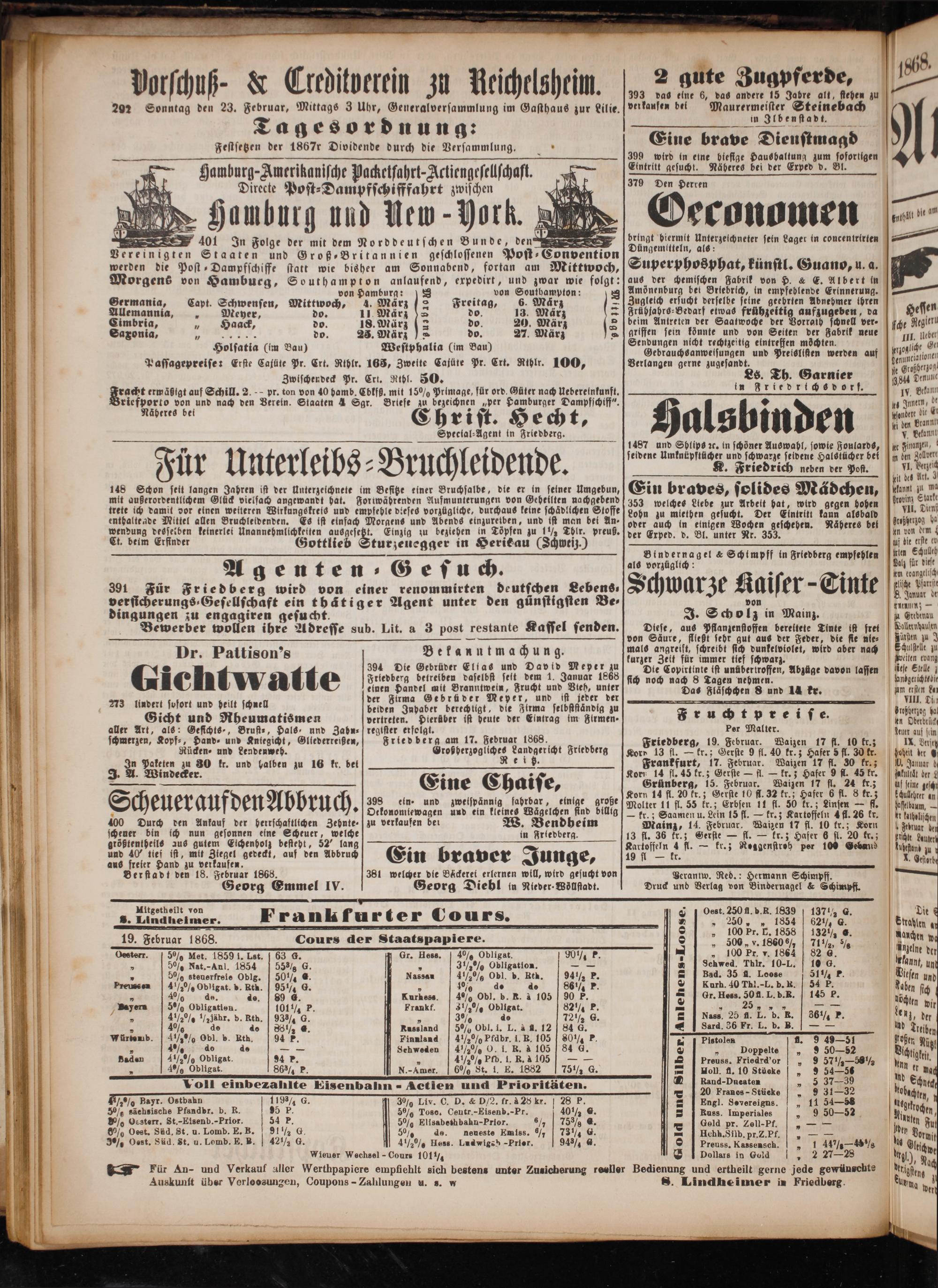 Friedberg, 19. Februar. Waizen 17 fl. 10 kr.; Korp 13 fl.— kr.; Gerste 9 fl. 40 kr.; Hafer 5 fl. 30 kr.