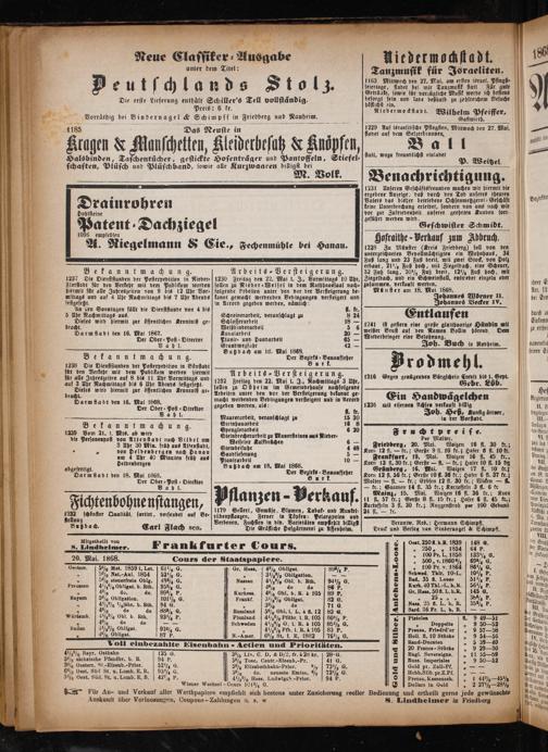 Friedberg, 20. Mai. Waizen 16 fl. 30 kr.; Korn 12 fl.— kr.; Gerste 9 fl. 10 kr. Hafer 6 fl. 10 kr.