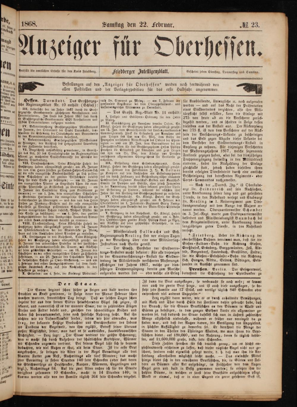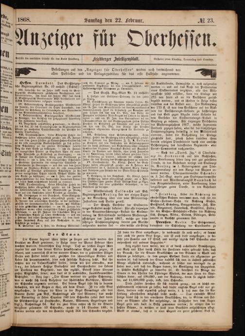4 1 4 5 55 2 3 2. 1868. Samstag den 22. Februar. 4 23. 0*— Gedach 1. agd 8 90 8 n 0 —. 2 8E enthalt die amtlichen Erlasse für den Kreis Friedberg. Friedberger Intelligenzblatt. Erscheint jeden Dienstag, Donnerstag und Samstag. eee 3 2 1— 8 4 1 N 10, 1 Bestellungen auf den„Anzeiger für Oberhessen“ werden noch fortwährend von Ade 9 9 2 0 5 9 18 5 5 2 1 *— allen Poststellen und der Verlagsexpedition für das erste Halbjahr angenommen 2 A. 5 g f N dert 4 Hessen. Darmstadt. Das Großherzog-talh Dr. Simtons zu Main;— am 7. Februar der für Aus bleibende, Untaugliche 1c. noch aufgerufen et ae liche Regierungsblatt Nr. 10 enthält(Schluß): pensionirte Regißralor bei dem Oberappellallens⸗ und werden— und auf das Recht der Präsentation — III. Uebersicht der im Jahre 1867 durch die Groß— ann a eines Stellvertreters verzichten, also ihre Mili— den 1 E rr— 5 Das Großh. Reg.-Blatt Nr. 11 enthält: tärpflicht selbst erfüllen, kann die Einlage mit 0 n. Im Laufe des Jahres 57 sind dur„ Polizei⸗ d Gebühren-Ordnung f Hafen 2 i ück⸗ 1 de Großberzogliche Gensdarmerie 4826 Arrestationen und zu Malm. ine een eee eee die, Versicherer zurück a 6844 Denuncialionen vollzogen worden. II. Ermächtigung zur Annahme fremder Orden. Se. bezahlt werden, und es scheiden in Folge dessen