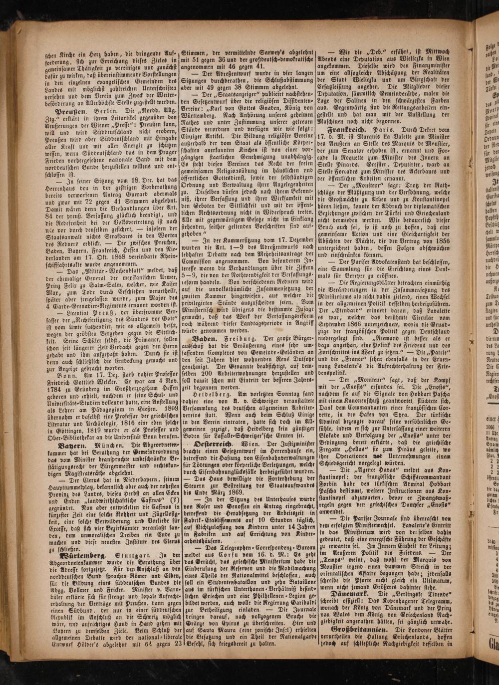 — Der„Staatsanzeiger“ publieirt nachstehen⸗ den Gesetzentwurf über die religiösen Dissidenten⸗ Vereine:„Karl von Gottes Gnaden, König von Württemberg. Nach Anhörung unseres geheimen Rathes und unter Zustimmung unserer getreuen Stände verordnen und verfügen wir wie folgt: Einziger Artikel. Die Bildung religiöser Vereine außerhalb der vom Staat als öffentliche Körper— schaften anerkannten Kirchen ist von einer vor⸗ gängigen staatlichen Genehmigung unabhängig. Es steht diesen Vereinen das Recht der freien gemeinsamen Religionsübung im häuslichen und öffentlichen Gottesdienst, sowie der selbständigen Ordnung und Verwaltung ihrer Angelegenheiten zu. Dieselben dürfen jedoch nach ihrem Bekennt⸗ niß, ihrer Verfassung und ihrer Wirksamkeit mit den Geboten der Sittlichkeit und mit der öffent— lichen Rechtsordnung nicht in Widerspruch treten. Alle mit gegenwärtigem Gesetze nicht im Einklang stehenden, seither geltenden Vorschriften sind auf— gehoben.“