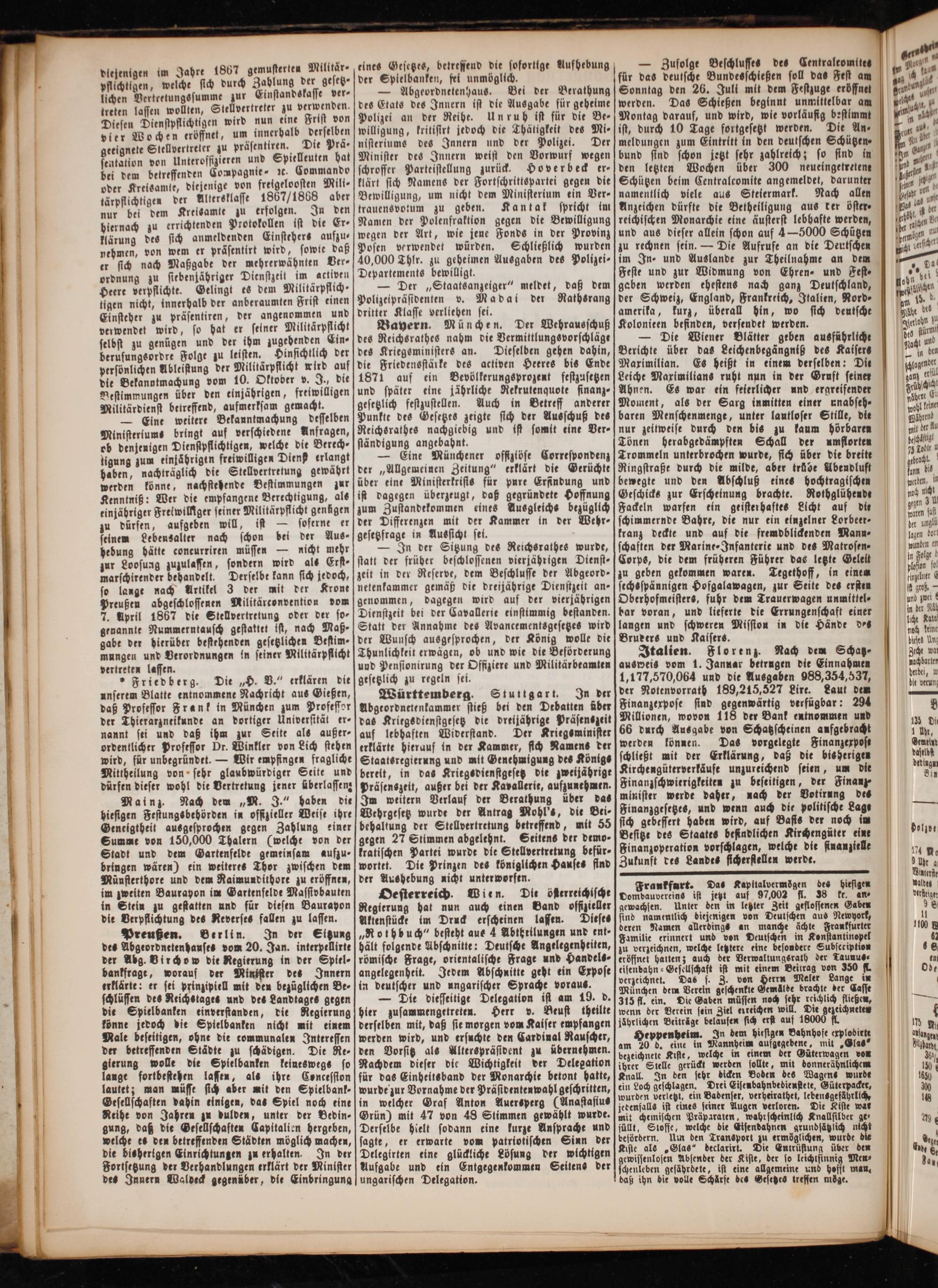 Bayern. München. Der Wehrausschuß des Reichsrathes nahm die Vermittlungsvorschläge des Kriegsministers an. Dieselben gehen dahin, die Friedensstärke des activen Heeres bis Ende 1871 auf ein Bevölkerungsprozent festzusetzen und später eine jährliche Rekrutenquote finanz- gesetzlich festzustellen. Auch in Betreff anderer Punkte des Gesetzes zeigte sich der Ausschuß des Reichsrathes nachgiebig und ist somit eine Ver⸗ ständigung angebahnt.
