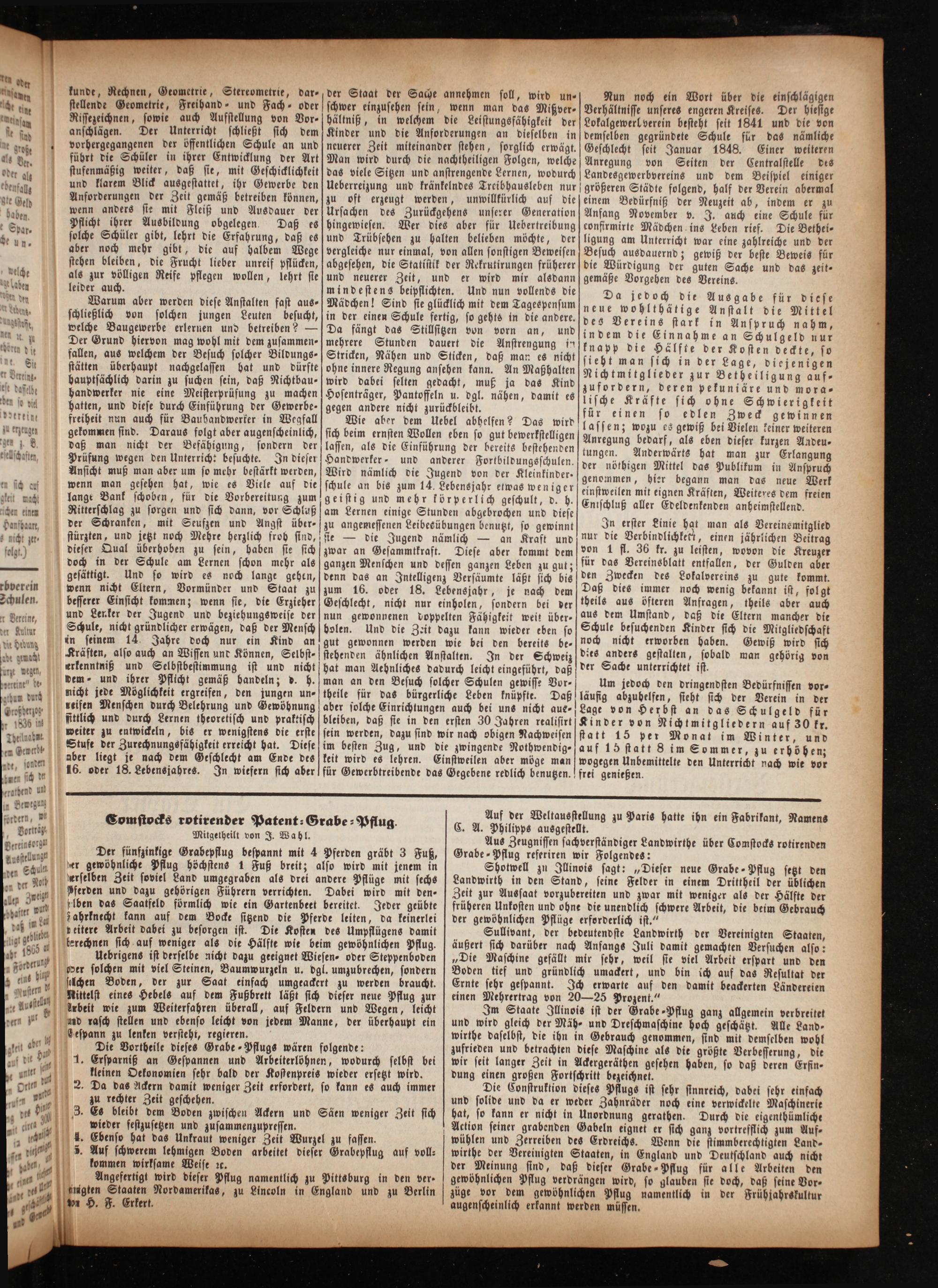 Comstocks rotirender Patent-Grabe⸗Pflug. C. A. eee zu Paris hatte ihn ein Fabrikant, Namens 4. Mitgetheilt von J. Wahl. Aus Zeugnissen sachverständiger Landwirthe über Comstocks rotirenden — Der fünfzinkige Grabepflug bespannt mit 4 Pferden gräbt 3 Fuß, Grabe-Pflug referiren wir Folgendes: . zer gewöhnliche Pflug höchstens 1 Fuß breit; also wird mit jenem in Shotwell zu Illinois sagt:„Dieser neue Grabe-Pflug setzt den beer ge, eerselben Zeit soviel Land umgegraben als drei andere Pflüge mit sechs[ Landwirth in den Stand, seine Felder in einem Drittheil der üblichen en 1 zIferden und dazu gehörigen Führern verrichten. Dabei wird mit den- Zeit zur Aussaat vorzubereiten und zwar mit weniger als der Hälfte der ad 35 5 ben das Saatfeld förmlich wie ein Gartenbeet bereitet. Jeder geübte früheren Unkosten und ohne die unendlich schwere Arbeit, die beim Gebrauch ebafttt 7 fahrknecht kann auf dem Bocke sitzend die Pferde leiten, da keinerlei der gewöhnlichen Pflüge erforderlich ist.“ en neitere Arbeit dabei zu besorgen ist. Die Kosten des Umpflügens damit Sullivant, der bedeutendste Landwirth der Vereinigten Staaten, 1 gebliee berechnen sich auf weniger als die Hälfte wie beim gewöhnlichen Pflug. äußert sich darüber nach Anfangs Juli damit gemachten Versuchen also: . 1800 Uebrigens ist derselbe nicht dazu geeignet Wiesen⸗ oder Steppenboden[„Die Maschine gefällt mir sehr, weil sie viel Arbeit erspart und den golden, deer solchen mit viel Steinen, Baumwurzeln u. dgl. umzubrechen, sondern[Boden tief und gründlich umackert, und bin ich auf das Resultat der 4 eint wa chen Boden, der zur Saat einfach umgeackert zu werden braucht.] Ernte sehr gespannt. Ich erwarte auf den damit beackerten Ländereien an Rittelst eines Hebels auf dem Fußbrekt läßt sich dieser neue Pflug zur einen Mehrertrag von 20—25 Prozent.“ „ ee rbeit wie zum Weiterfahren überall, auf Feldern und Wegen, leicht Im Staate Illinois ist der Grabe-Pflug ganz allgemein verbreitet dern gur ind rasch stellen und ebenso leicht von jedem Manne, der überhaupt ein und wird gleich der Mäh- und Dreschmaschine hoch geschätzt. Alle Land „HGespann zu lenken versteht, regieren. wirthe daselbst, die ihn in Gebrauch genommen, sind mit demselben wohl det abel! Die Vortheile dieses Grabe-Pflugs wären folgende: zufrieden und betrachten diese Maschine als die größte Verbesserung, die uf die he 1. Ersparniß an Gespannen und Arbeiterlöhnen, wodurch selbst beine] wir seit langer Zeit in Ackergeräthen gesehen haben, so daß deren Erfin- „ ute een kleinen Oekonomien sehr bald der Kostenpreis wieder ersetzt wird. dung einen großen Fortschritt bezeichnet. nn* 2. Da das Ackern damit weniger Zeit erfordert, so kann es auch immer Die Construktion dieses Pflugs ist sehr sinnreich, dabei sehr einfach 0 vine zu rechter Zeit geschehen. und solide und da er weder Zahnräder noch eine verwickelte Maschinerie 76 b, 3. Es bleibt dem Boden zwischen Ackern und Säen weniger Zeit sich hat, so kann er nicht in Unordnung gerathen. Durch die eigenthümliche gutt 1 wieder festzusetzen und zusammenzupressen. Action seiner grabenden Gabeln eignet er sich ganz vortrefflich zum Auf- iche J. Ebenso hat das Unkraut weniger Zeit Wurzel zu fassen. wühlen und Zerreiben des Erdreichs. Wenn die stimmberechtigten Land- * a 5. Auf schwerem lehmigen Boden arbeitet dieser Grabepflug auf voll- wirthe der Vereinigten Staaten, in England und Deutschland auch nicht bahn kommen wirksame Weise ꝛc. der Meinung sind, daß dieser Grabe-Pflug für alle Arbeiten den 2 1 Angefertigt wird dieser Pflug namentlich zu Pittsburg in den ver. gewöhnlichen Pflug verdrängen wird, so glauben sie doch, daß seine Vor⸗ * 70 10% fiugten Staaten Nordamerikas, zu Lincoln in England und zu Berlin züge vor dem gewöhnlichen Pflug namentlich in der Frühjahrskultur 1% H. F. Erkert. augenscheinlich erkannt werden müssen. 11¹ LI 1