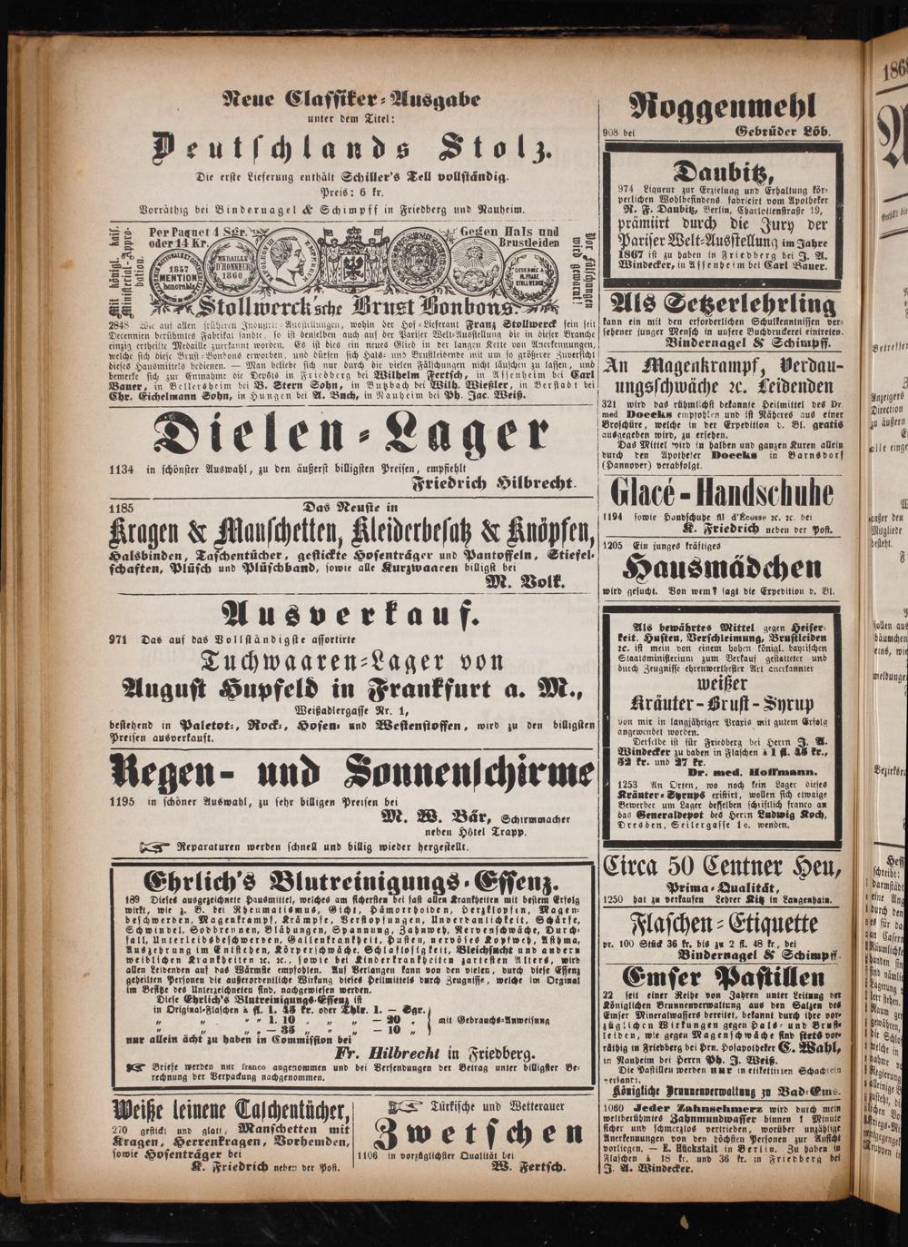 1867 ist zu haben in Friedberg bei J. A. Windecker, in Assenheim bei Earl Bauer.