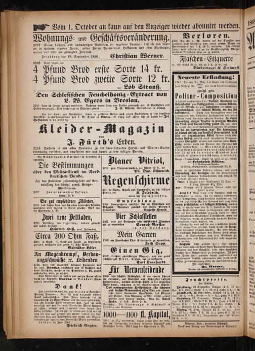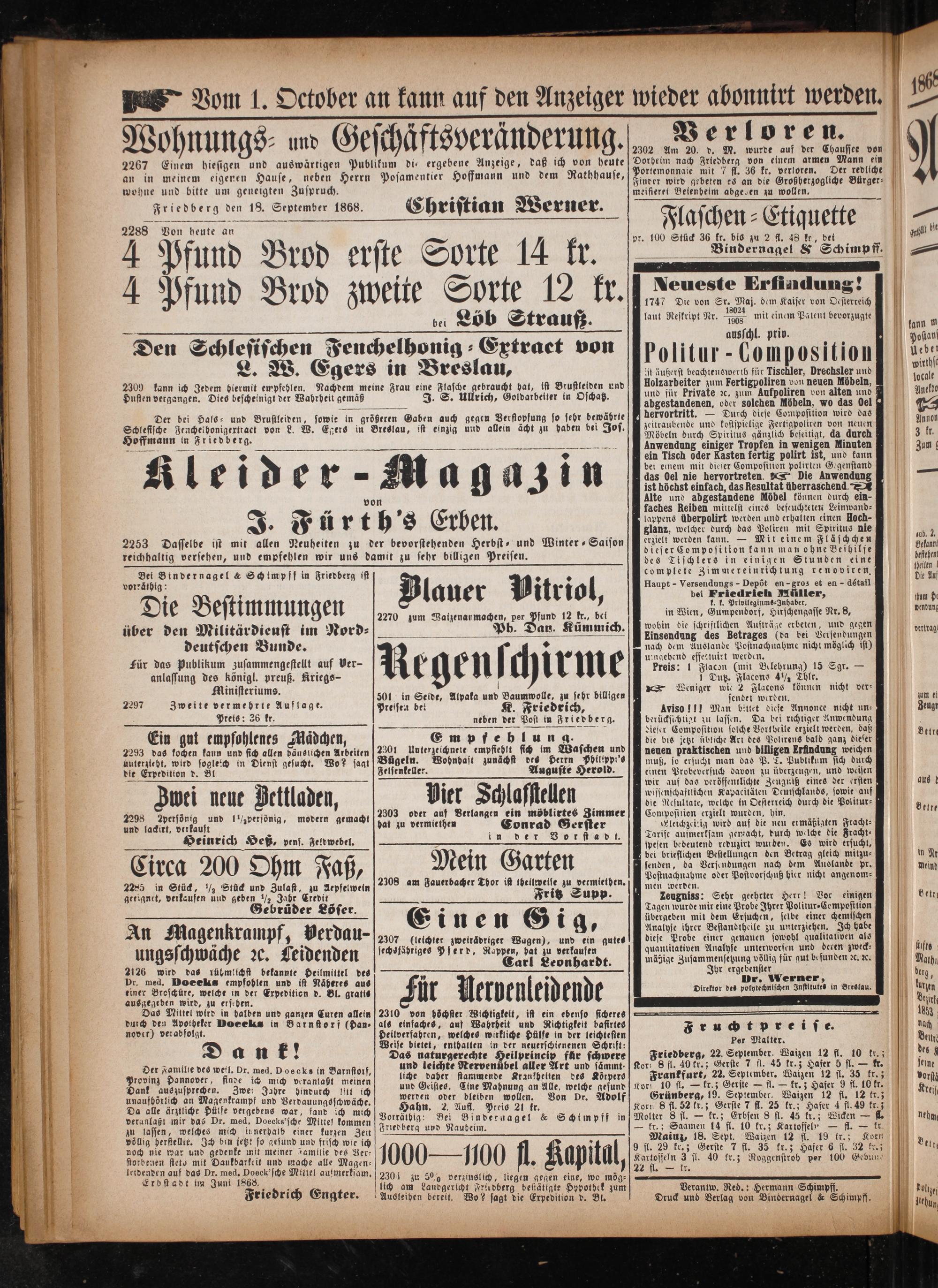 wohne und bitte um geneigten Zuspruch. Friedberg den 18. September 1868.