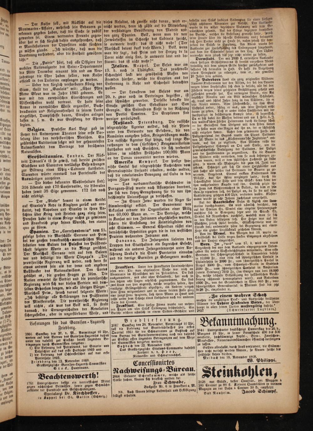 Brod lieferung. Samßag den 28. November, Vormittags 10 Uhr, soll die Lieferung des Brodbedürfsnisses pro erstes Quartal 1869 für die Schwadronen zu Butzbach auf dem Bureau der Garnisonverwaltung nach den daselbst zur Einsicht offen liegenden Bedingungen auf dem Wege der Summisston vergeben werden.