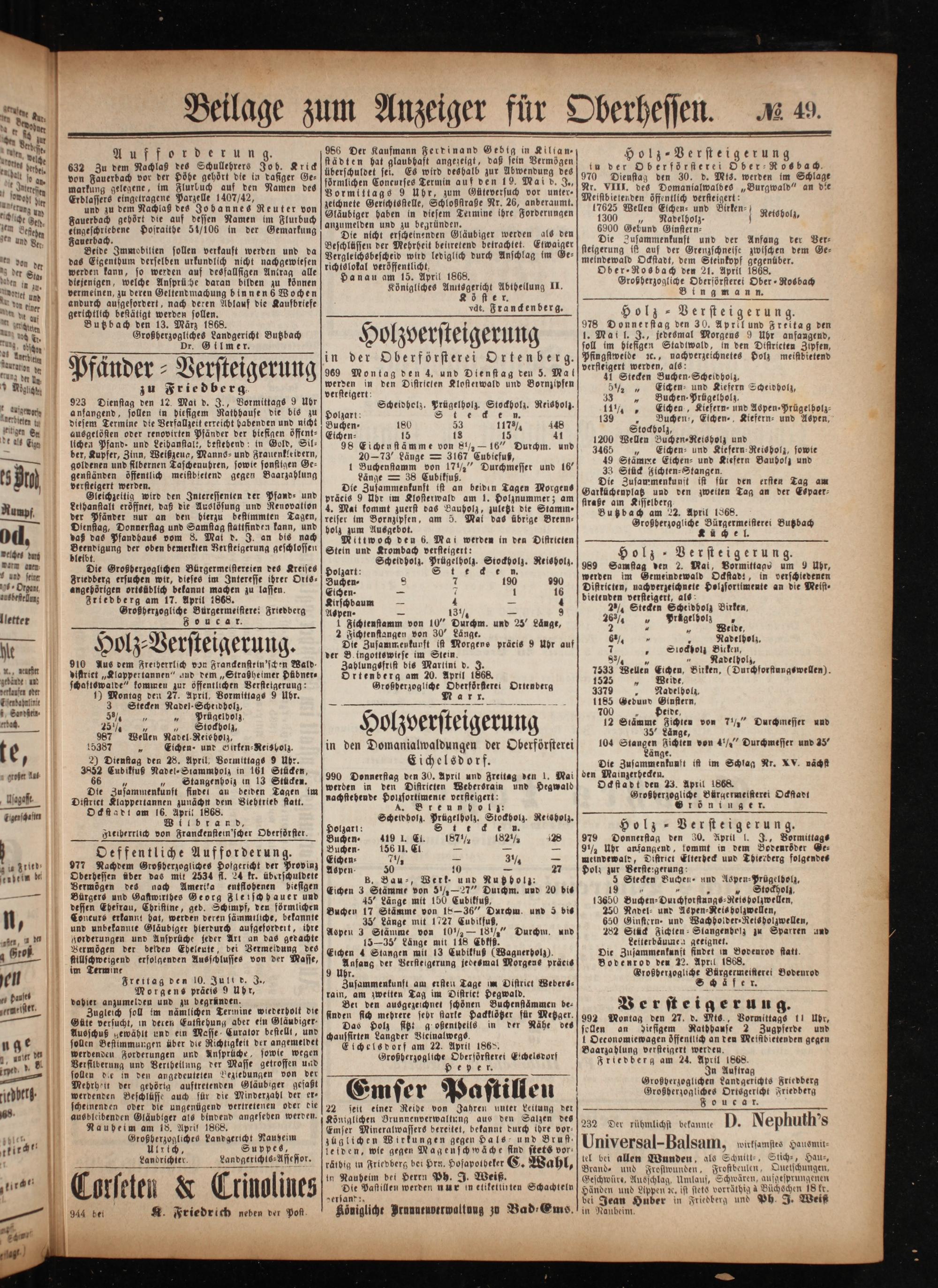 2 Fichtenstangen von 30“ Länge. Die Zusammenkunft ist Morgene präcis 9 Uhr auf der Be ingottswiese im Stein. Zahlungsfrist dis Martint d. J. Ortenberg am 20. April 1868. Großberzogliche Oberförstere! Ortenberg Nar x.