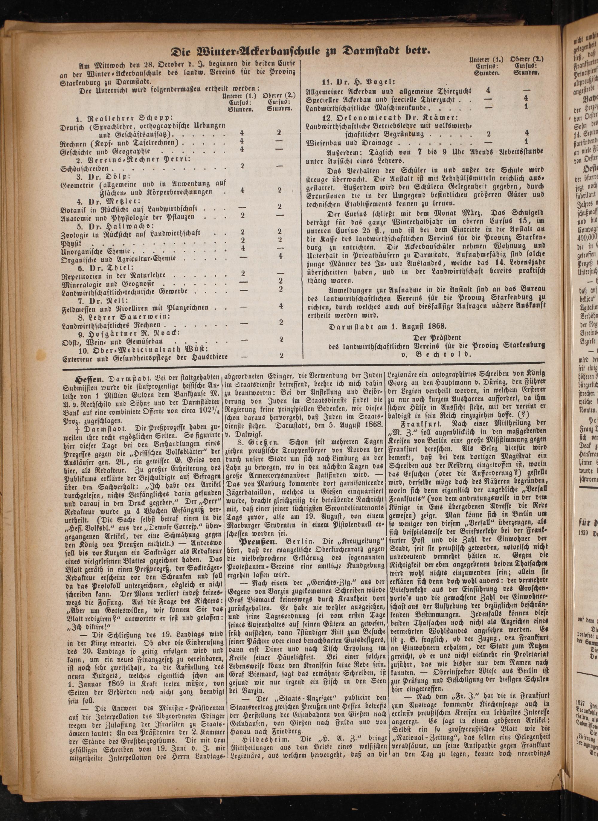 Botanik in Rücksicht auf Landwirthschaft.— 2 technischen Etablissements kennen zu lernen. Anatomie und Physiologie der Pflanzen 2— Der Cursus schließt mit dem Monat März. Das Schulgeld 5. Dr. Hallwachs: beträgt für das ganze Winterhalbjahr im oberen Cursus 15, im Zoologie in Rücksicht auf Landwirthschaft. 2 2 unteren Cursus 25 fl., und ist bei dem Eintritte in die Anstalt an JJrJrTTJĩĩ// ĩ˙0 2 2 die Kasse des landwirthschaftlichen Vereins für die Provinz Starken⸗ Unorganische Chemie 2— burg zu entrichten. Die Ackerbauschüler nehmen Wohnung und Organische und Agricultur-Chemie.— 4 Unterhalt in Privathäusern zu Darmstadt. Aufnahmefähig sind solche 6. Dr. Thiel: junge Männer des In- und Auslandes, welche das 14. Lebensjahr Repetitorien in der Naturlehrre— üͤberschritten haben, und in der Landwirthschaft bereits praktisch Mineralogie und Geognosie 5 2 thätig waren. Landwirthschaftlich⸗technische Gewerbe 5 2 Anmeldungen zur Aufnahme in die Anstalt sind an das Bureau Din Nell: b f des landwirthschaftlichen Vereins für die Provinz Starkenburg zu Feldmessen und Nivelliren mit Planzeichnen.— 4 richten, durch welches auch auf diesfallsige Anfragen nähere Auskunft 8. Lehrer 5 ertheilt werden wird. erer K Nacht Darmstadt am 1. August 1868. Obst⸗, Wein⸗ und Gemüse bau— 2 Der Präsident 10. Ober⸗Medicinalrath Wüst: des landwirthschaftlichen Vereins für die Provinz Starkenburg Exterieur und Gesundheitspflege der Hausthiere— 2 v. Bechtold.