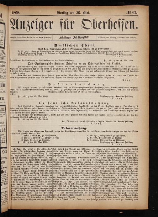 neldungen schriftlich zukommen zu lassen. Friedberg den 23. Mai 1868.