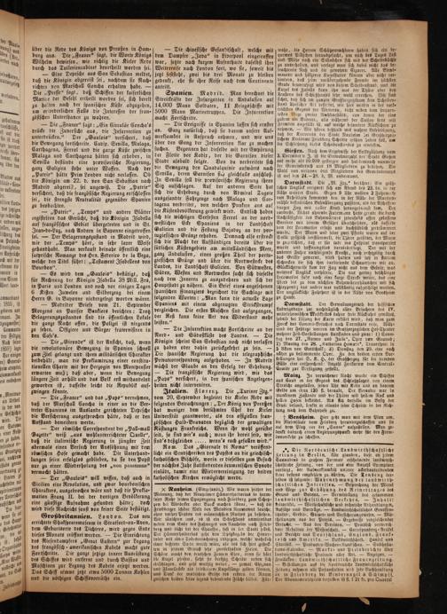 Spanien. Madrid. Man berechnet die Streitkräfte der Insurgenten in Andalusien auf 14,000 Mann Soldaten, 11 Kriegsschiffe mit 5000 Mann Marinetruppea. Die Insurrection macht Fortschritte.