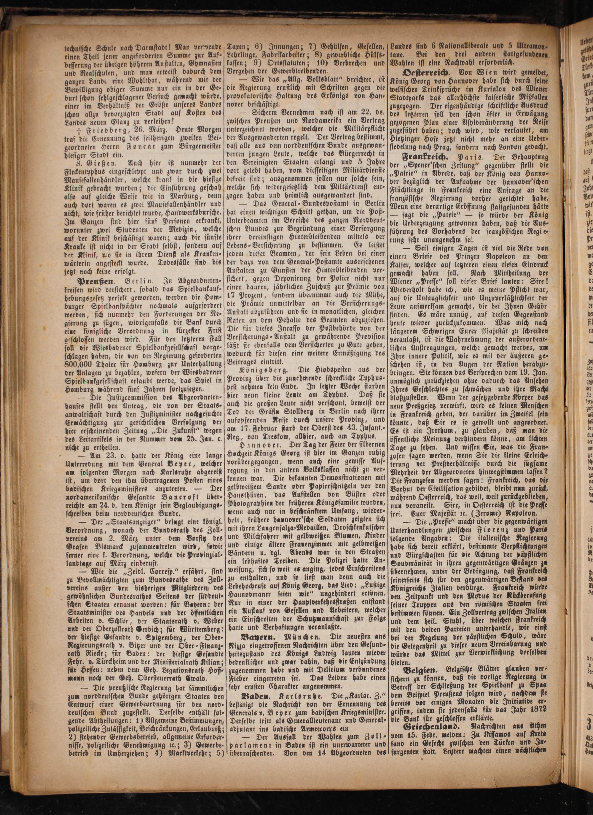 S. Gießen. Auch hier ist nunmehr der Fleckentyphus eingeschleppt und zwar durch zwei Mausefallenhändler, welche krank in die hiesige Klinik gebracht wurden; die Einführung geschah also auf gleiche Weise wie in Marburg, denn auch dort waren es zwei Mausefallenhändler und nicht, wie früher berichtet wurde, Handwerksbursche. Im Ganzen sind hier fünf Personen erkrankt, worunter zwei Studenten der Medizin, welche auf der Klinik beschäftigt waren; auch die fünfte Kranke ist nicht in der Stadt selbst, sondern auf der Klinik, wo sie in ihrem Dienst als Kranken- wärterin angesteckt wurde. Todesfälle sind bis jetzt noch keine erfolgt.