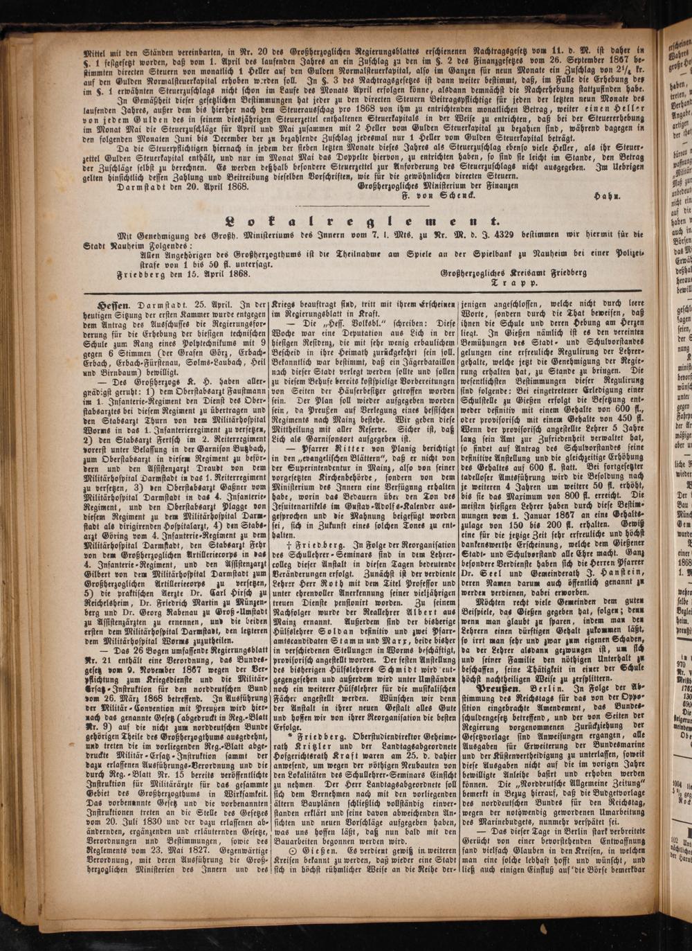 — Das 26 Bogen umfassende Regierungsblatt Nr. 21 enthält eine Verordnung, das Bundes ⸗ gesetz vom 9. November 1867 wegen der Ver⸗ pflichtung zum Kriegsdienste und die Militär⸗ Ersaßg ⸗Instruktion für den norddeutschen Bund vom 26. März 1868 betreffend. In Ausführung der Militär Convention mit Preußen wird hier⸗ nach das genannte Gesetz(abgedruckt in Reg.-Blatt auf die nicht zum norddeutschen Bunde gehörigen Theile des Großherzogthums ausgedehnt, und treten die im vorliegenden Reg.⸗Blatt abge⸗ druckte Militär ⸗Ersatz⸗Instruktion sammt der dazu erlassenen Ausführungs⸗Verordnung und die durch Reg.⸗Blatt Nr. 15 bereits veröffentlichte Instruktion für Militärärzte für das gesammte Gebiet des Großherzogthums in Wirksamkeit. Das vorbenannte Gesetz und die vorbenannten Instruktionen treten an die Stelle des Gesetzes vom 20. Juli 1830 und der dazu erlassenen ab⸗ ändernden, ergänzenden und erläuternden Gesetze, Verordnungen und Bestimmungen, sowie des Reglements vom 23. Mai 1827. Gegenwärtige Verordnung, mit deren Ausführung die Groß⸗ herzoglichen Ministerien des Innern und des
