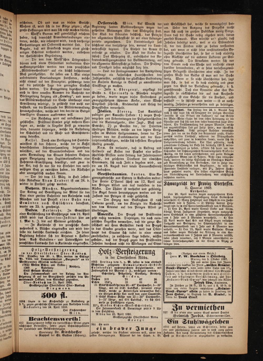 Den 20. April wurden wegen ausgezeichneten Dieb⸗ stahls, beziehungsweise Begünstigung dieses Verbrechens verurtheilt: 1) Georg Herzberger aus Echzell in eine Zucht⸗ hausstrafe von 5 Jahren.— 2) Philipp Conrad Herz⸗ berger von da in eine Correctionshausstrafe von 6 Monaten. — 3) Den 21. April wurde Conrad Linker aus Wiera, Königl. Preuß. Justizamts Ziegenhain, wegen ausgezeich⸗ neten Diebstahls in eine geschärfte Correctionshausstrafe von 1 Jahr und 3 Monaten verurtheilt.— 4) Den 22. April wurde Carl Erb aus Echzell wegen versuchter Nothzucht und Verletzung der Schamhaftigkeit in eine Correctionshausstrafe von 1 Jahr und 6 Monaten ver⸗ urtheilt.— 5) Den 23. April wurde Balthasar Bieran aus Lollar wegen Versuchs der Tödtung in eine Cor⸗ rectionshausstrafe von 2 Jahren und 3 Monaten verfällt, dabei jedoch verordnet, daß 3 Monate unverschuldet er⸗ littene Untersuchungshaft an der Strafe in Abzug zu bringen seien.