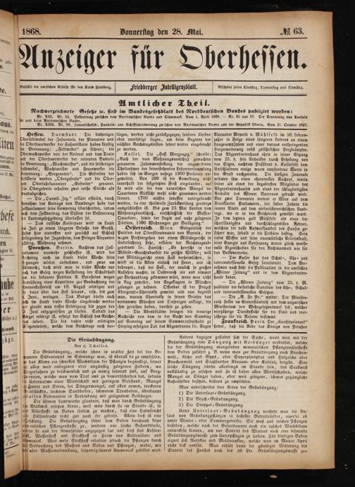 N Sriedberger Jutelligenzblatt. Erscheint jeden Dienstag, Donnerstag und Samstag. Amtlicher Theil. a Nachverzeichnete Gesetze ꝛc. sind im Bundesgesetzblatt des Norddeutschen Bundes publizirt worden: . Nr. XII. Nr. 95. Poflvertrag zwischen dem Norddeutschen Bunde und Dänemark. Vom 1. April 1868.— Nr. 96 und 97. Die Ecnennung von Consuln 8 fur und beim Norddeutschen Bunde. Aus. Nr. XIII. Nr. 98. Freundschafts-, Pandels⸗ und Schifffahrtsvertrag zwischen dem Norddeutschen Bunde und der Republik Liberta. Vom 31. October 1867. woch den